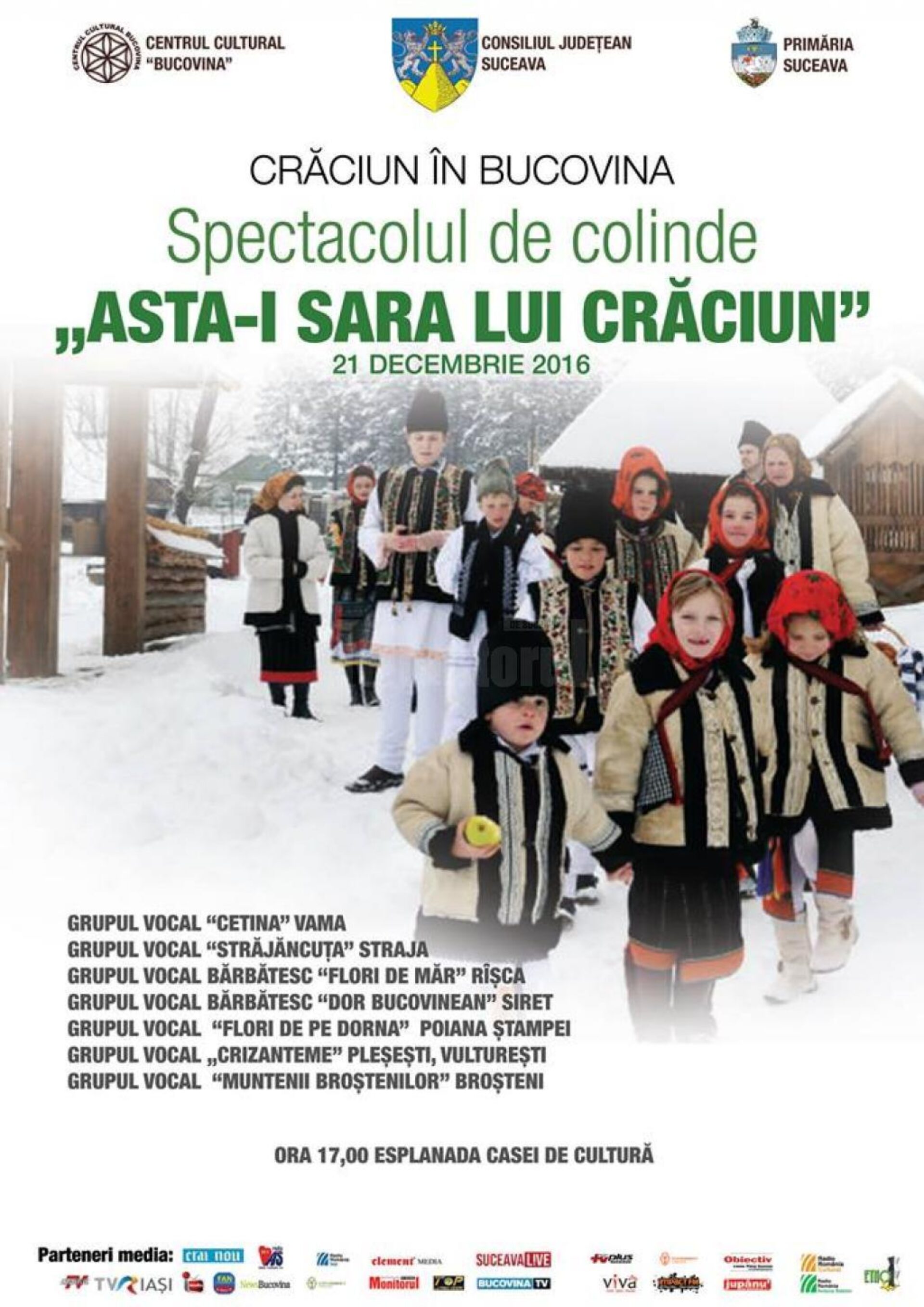 Consiliul Județean Suceava, Centrul Cultural „Bucovina” și Primăria Suceava organizează miercuri, 21 decembrie a.c., la ora 17.00, pe esplanada Casei de Cultură Suceava, spectacolul de colinde „Asta-i sara lui Crăciun”.
