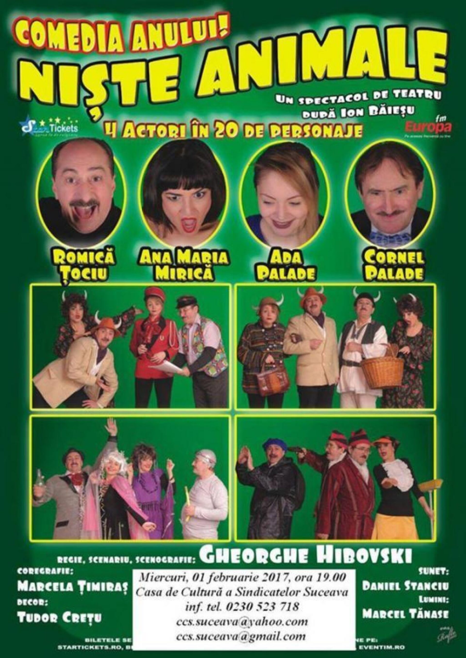 Spectacolul „Niște animale”, programat pentru miercuri, 1 februarie 2017, la Casa de Cultură Suceava, de la ora 19.00, a fost anulat.