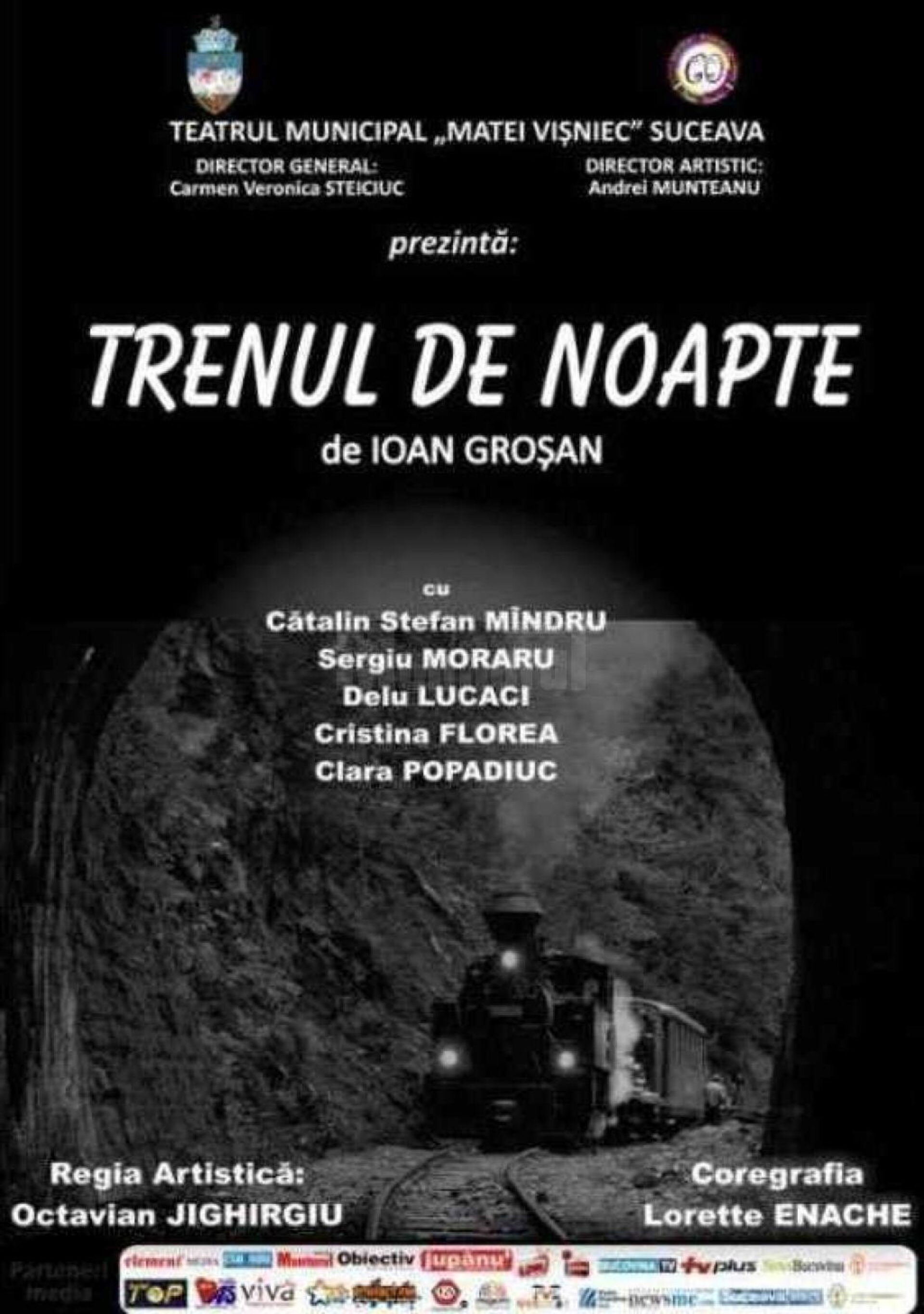 Sucevenii sunt așteptați la finele acestei săptămâni, în zona Gării Burdujeni, la o nouă serie de spectacole neconvenționale a tinerei echipe a Teatrului Municipal „Matei Vișniec”. Astfel, sâmbătă, 27 august, și duminică, 28 august, de la ora 20.00, va avea loc spectacolul “Trenul de noapte”, după o piesă scrisă de Ioan Groșan, regia artistică Octavian Jighirgiu. Reprezentația va avea loc pe str. Nicolae Iorga nr. 7, vizavi de Hotelul Residenz, între Gara Burdujeni și pasarela CFR.