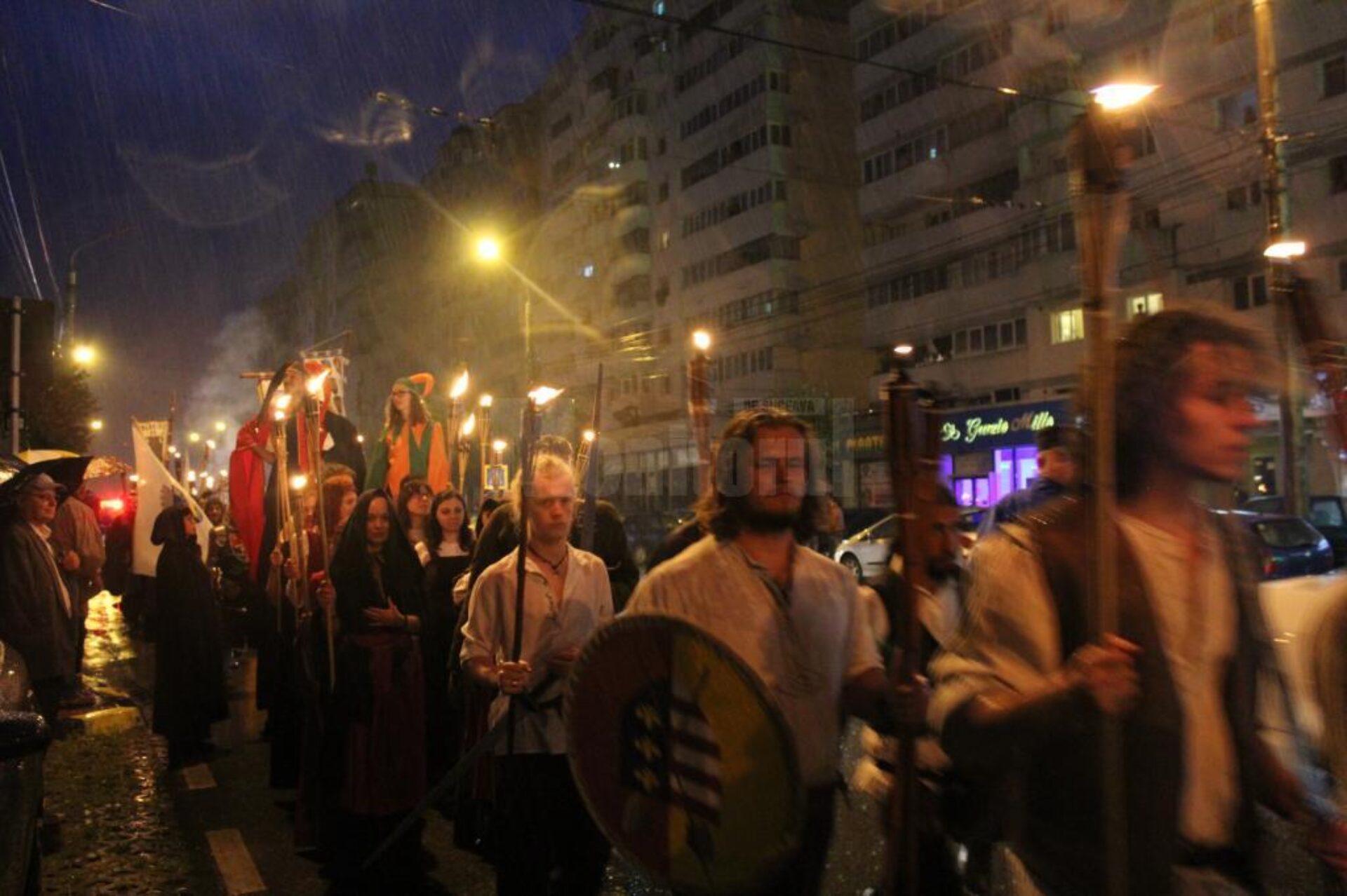 Parada cu făclii a cavalerilor și domnițelor care participă la Festivalul de Artă Medievală „Ștefan cel Mare”, pe străzile Sucevei, s-a dovedit a fi un spectacol fascinant, cu mare priză la suceveni, care au venit cu mic, cu mare, în ciuda vremii potrivnice.
