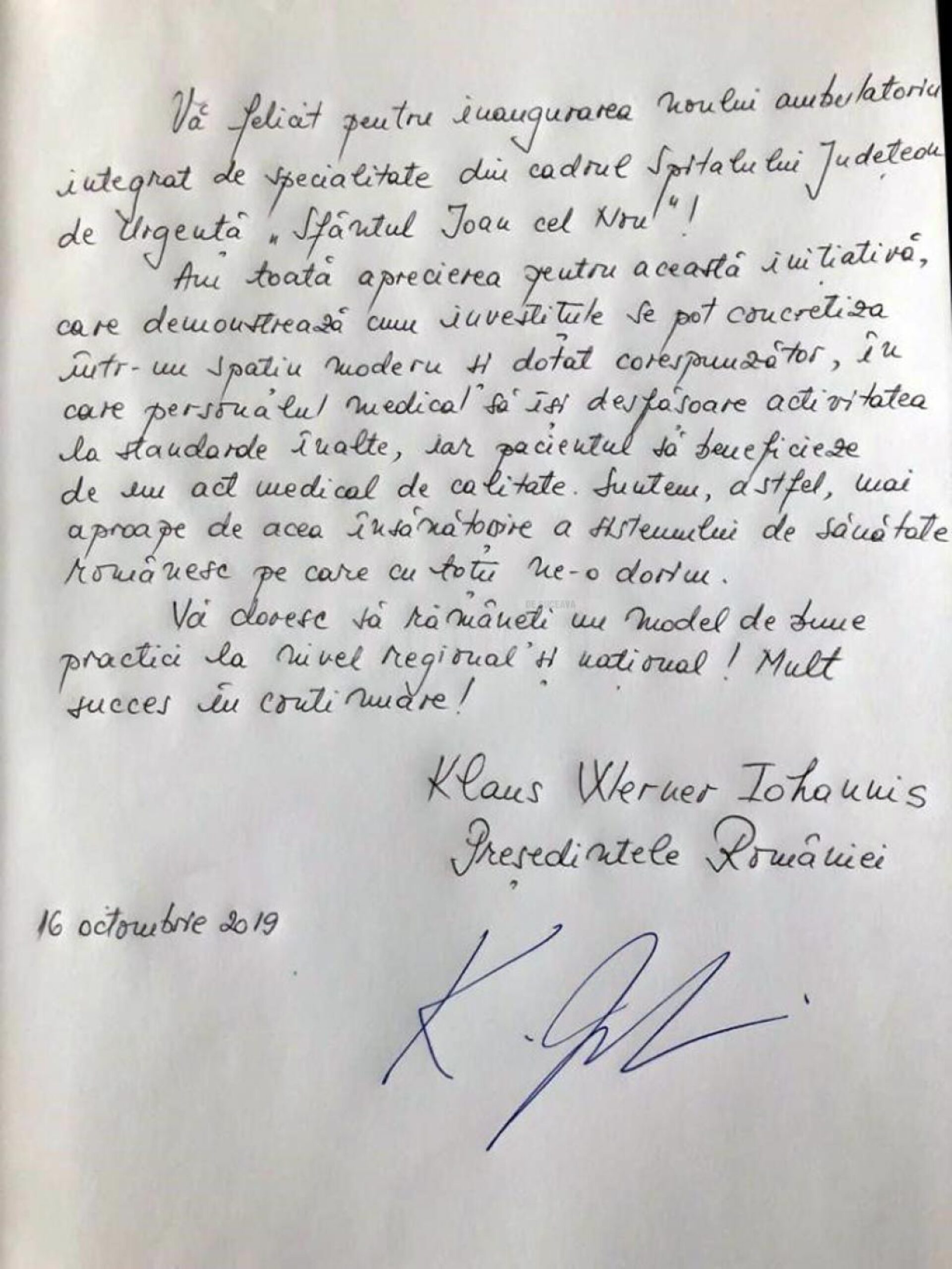 Președintele României, Klaus Werner Iohannis, a scris, miercuri, un mesaj în Cartea de Onoare a Spitalului de Urgență „Sfântul Ioan cel Nou” Suceava, cu ocazia participării sale la inaugurarea noului ambulatoriu de specialitate.