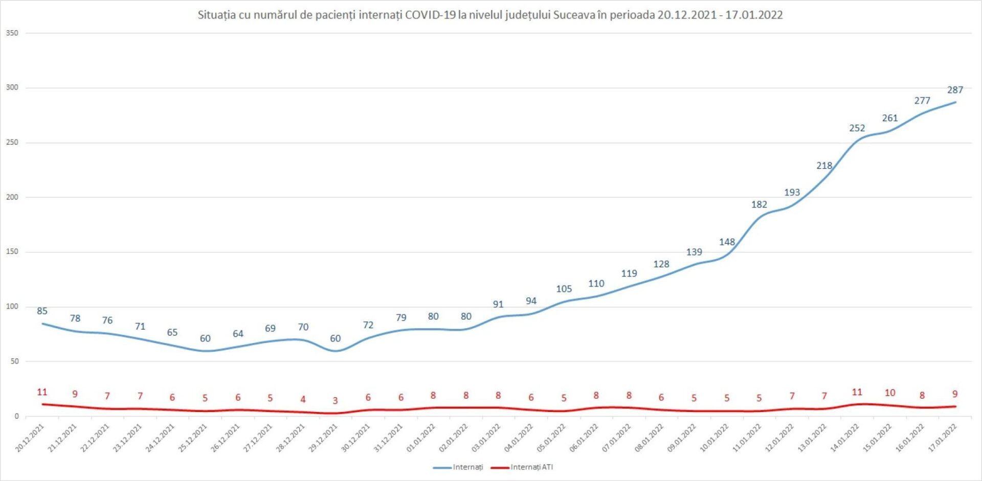 Numărul pacienților cu Covid internați în spitale este în continuare în creștere, dar numărul zilnic de internări are de 4 zile o ușoară tendință de scădere, menținându-se la mai puțin de 15 cazuri internate în 24 de ore. Luni dimineață, în spitalele din județul Suceava se aflau 287 de pacienți diagnosticați cu Covid, dintre care 30 copii, și încă 32 de pacienți suspecți de infectare, din care 24 de adulți și 8 copii.