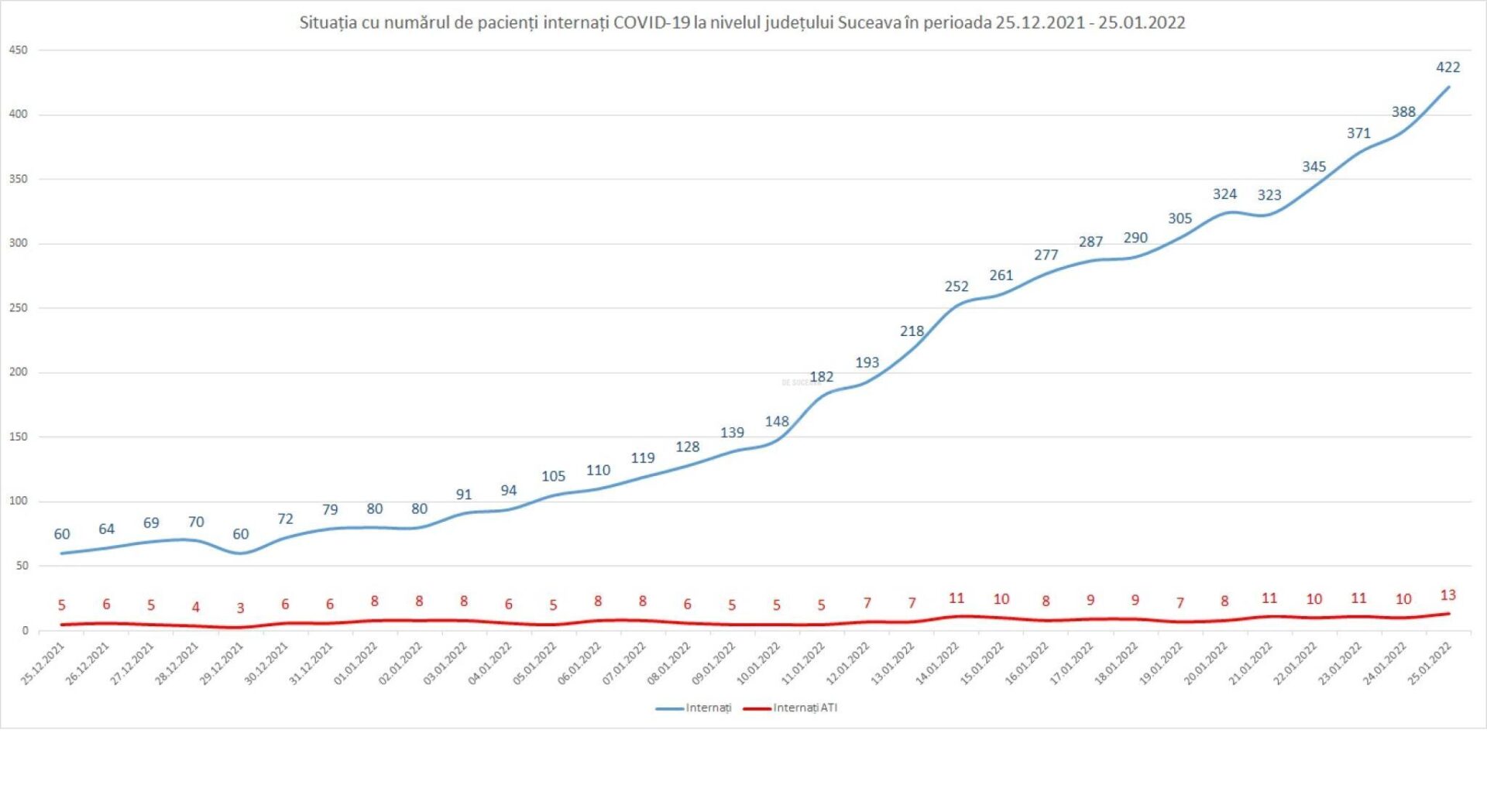 Marți în spitalele din județul Suceava erau internați 422 de pacienți cu Covid, din care 39 copii, și mai erau disponibile 81 de locuri libere în secțiile Covid și 46 de locuri pentru zona tampon.