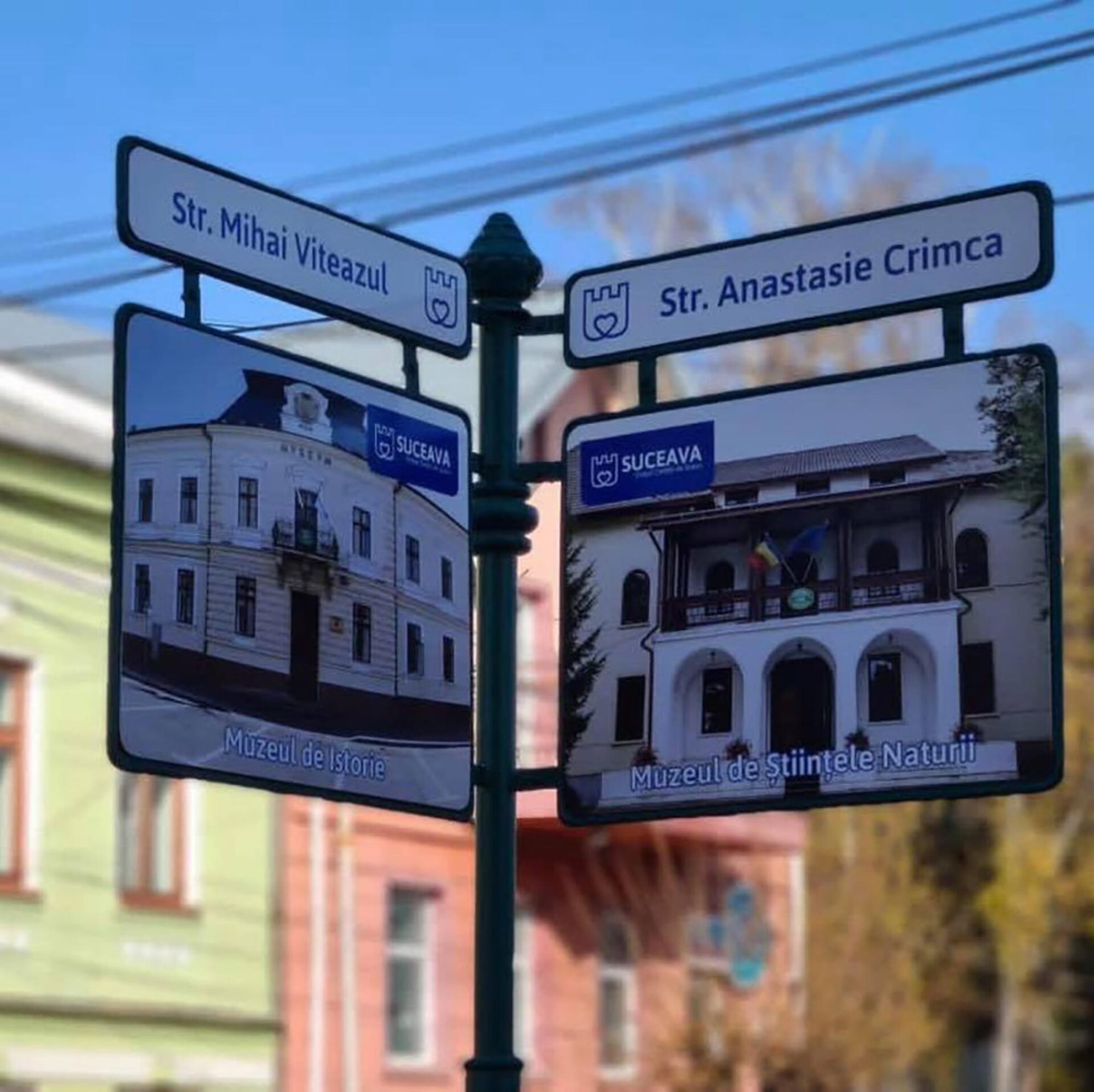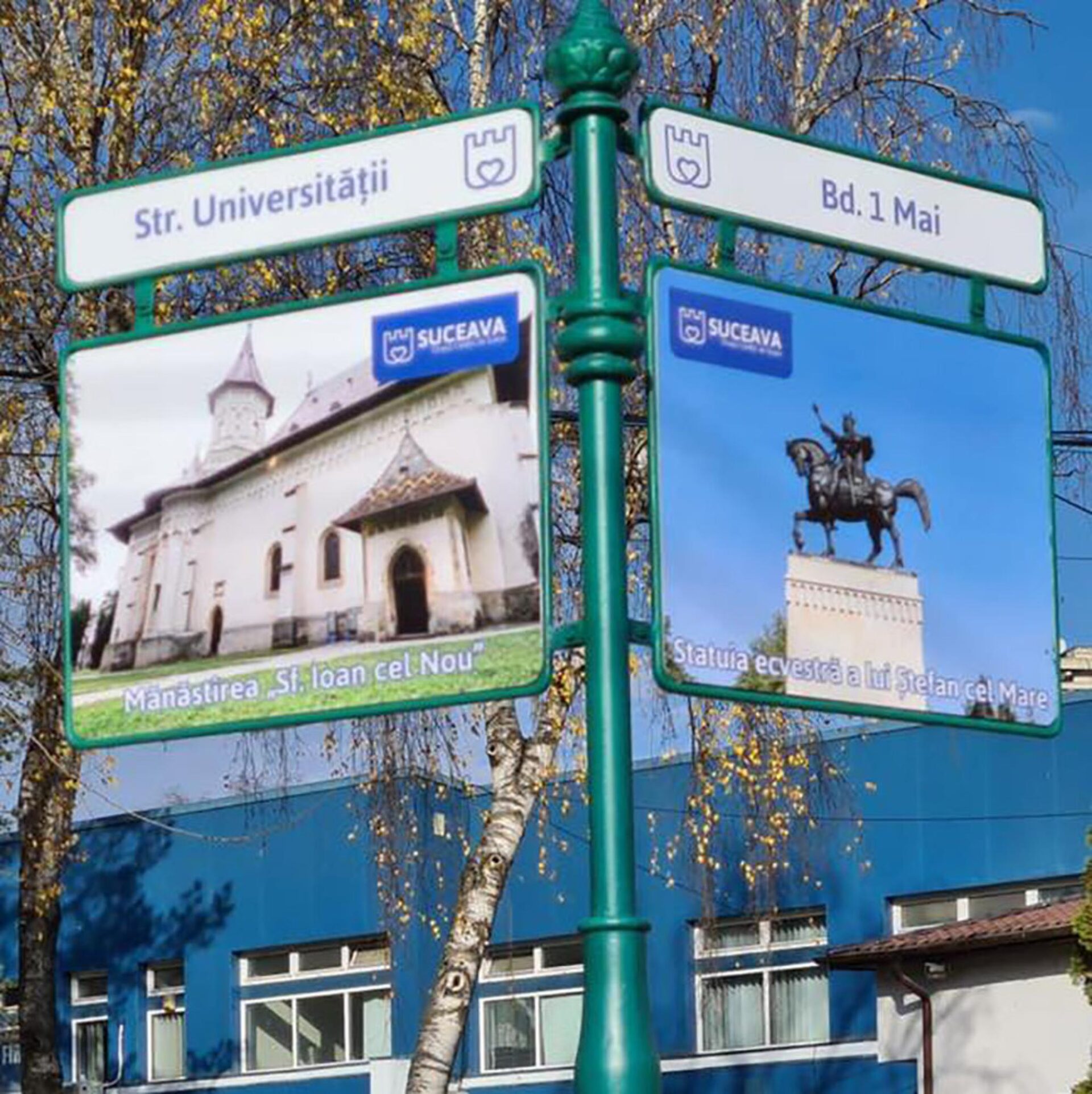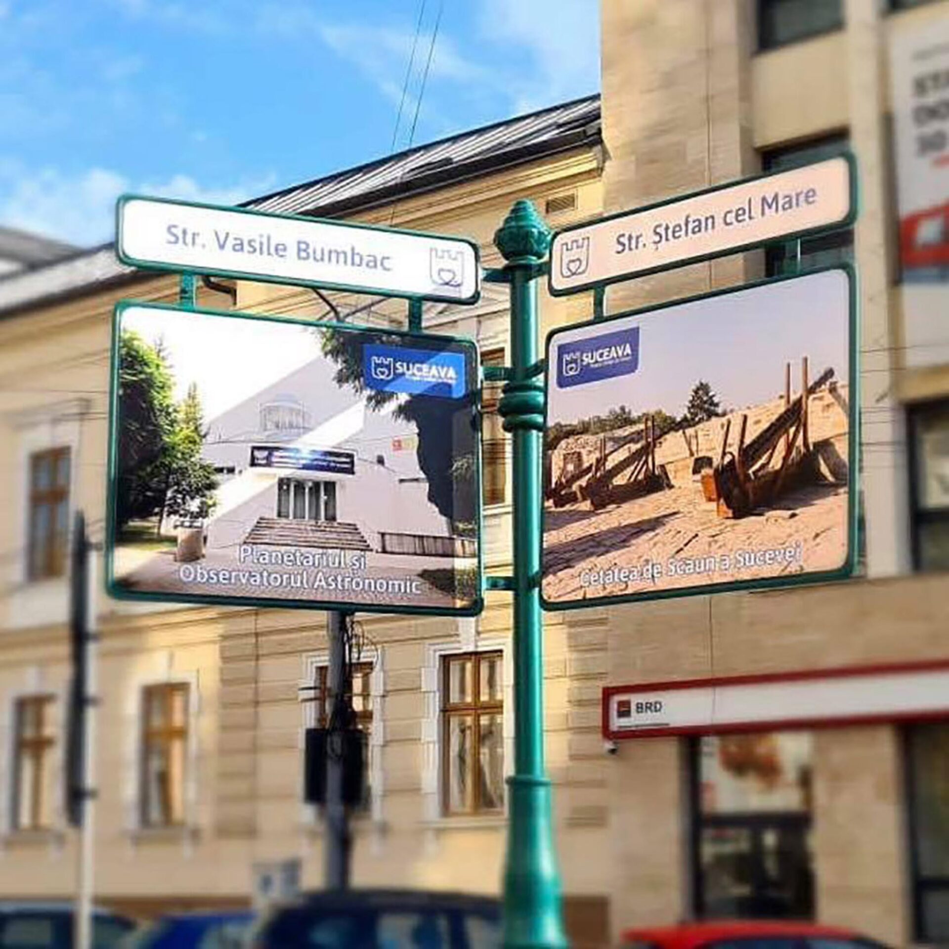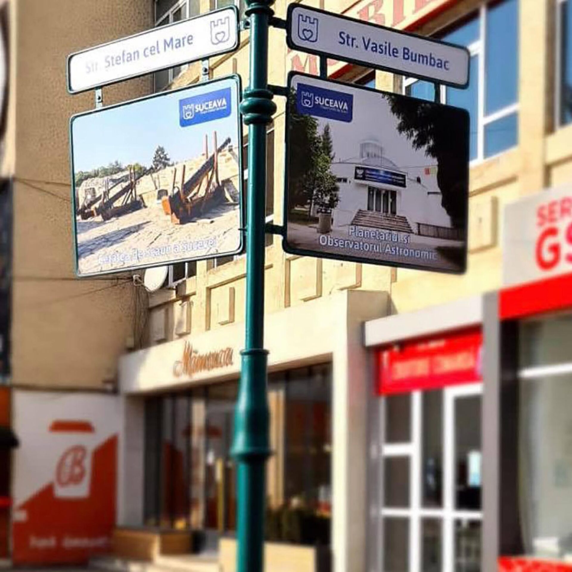 Stâlpi informativi cu denumirile străzilor și principalele obiective turistice din Suceava