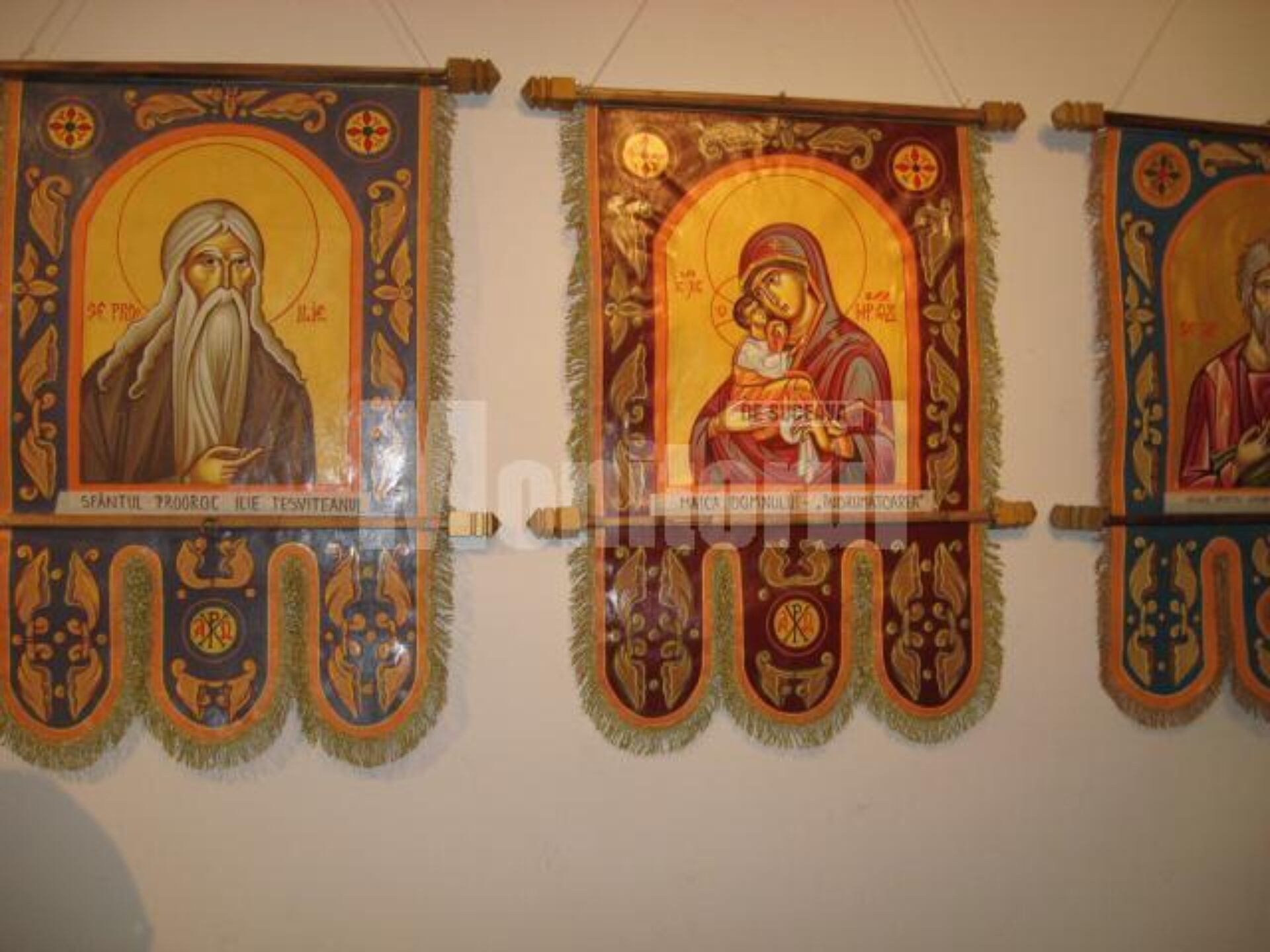 Părintele Gavrilean, care slujește la Biserica Sfinții Împărați Constantin și Elena din municipiul Gura Humorului, expune icoane pictate pe lemn și prapuri bisericești pictați pe pânză, lucrări realizate pe parcursul unui an.