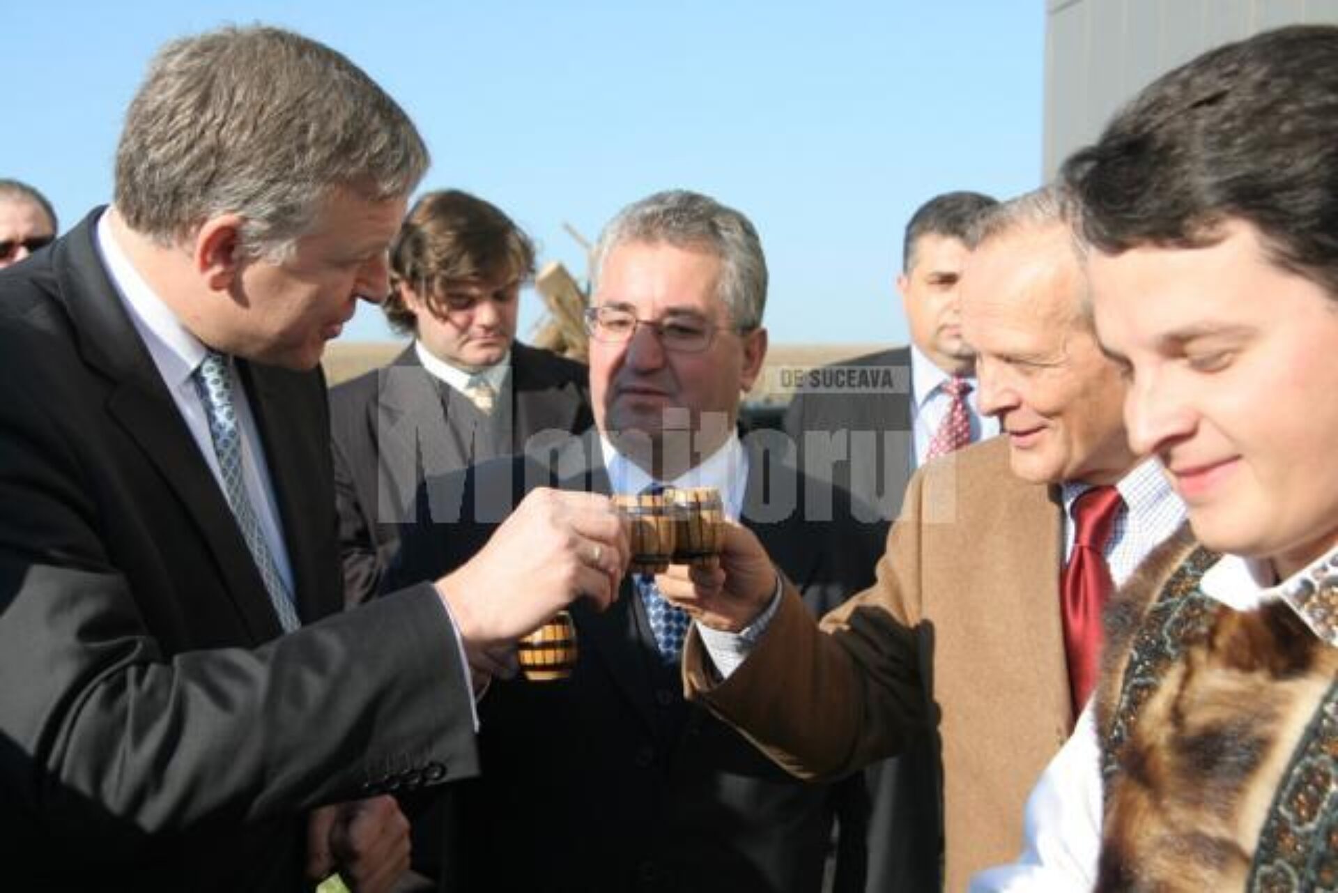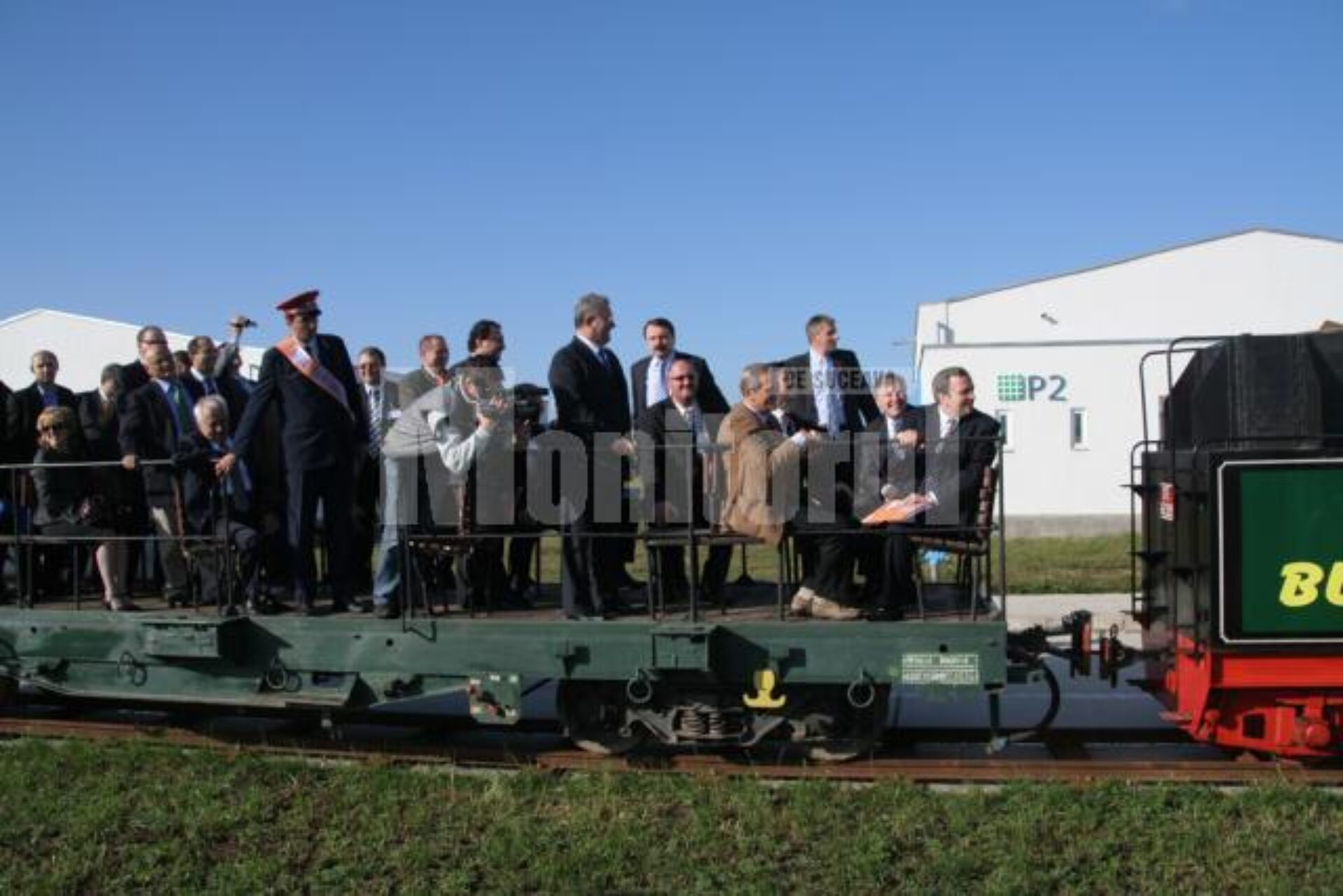 La sosirea în incinta Centrului Economic Bucovina, oficialitățile au fost întâmpinate cu cântec de buciume, după care șeful administrației județene, Flutur, s-a urcat direct în locomotiva mocăniței. Flutur l-a invitat alături de el și pe Theodor Stolojan, iar după ce au tras semnalul de pornire, s-au urcat în vagonul mocăniței pentru o scurtă plimbare cu singurul tren pe linie îngustă din județul Suceava.