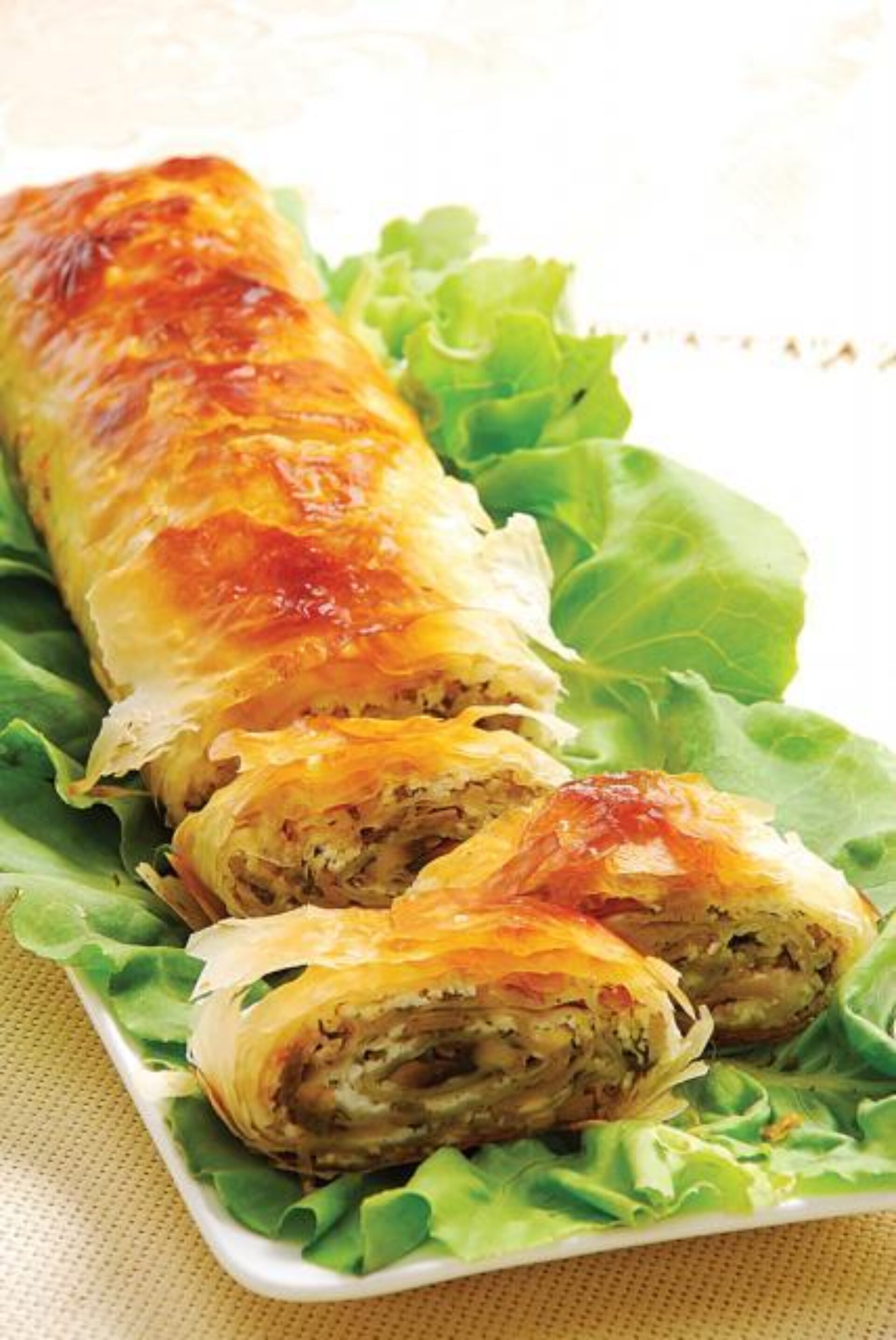 Căliți în unt ceapa tăiată mărunt și usturoiul pisat. Când ceapa începe să se îngălbenească adăugați ciupercile tăiate în felii subțiri, și vinul. Lăsați vasul pe foc potrivit până când se înmoaie ciupercile. Opriți focul și lăsați amestecul la răcit. Adăugați brânza rasă și ierburile în amestecul rece. Omogenizați compoziția și condimentați-o cu sare și piper. Suprapuneți 5 – 6 foi de plăcintă, unse cu ulei. Turnați amestecul cu ciuperci pe foi și rulați-le. Puneți ștrudelul într-o tavă de chec tapetată cu folie de copt. Tăiați câteva romburi în stratul de foi de deasupra. Coaceți ștrudelul la foc potrivit, 15 – 20 de minute, lăsați-l apoi să se răcească puțin și tăiați-l în felii cu grosimea de 2 – 3 cm.