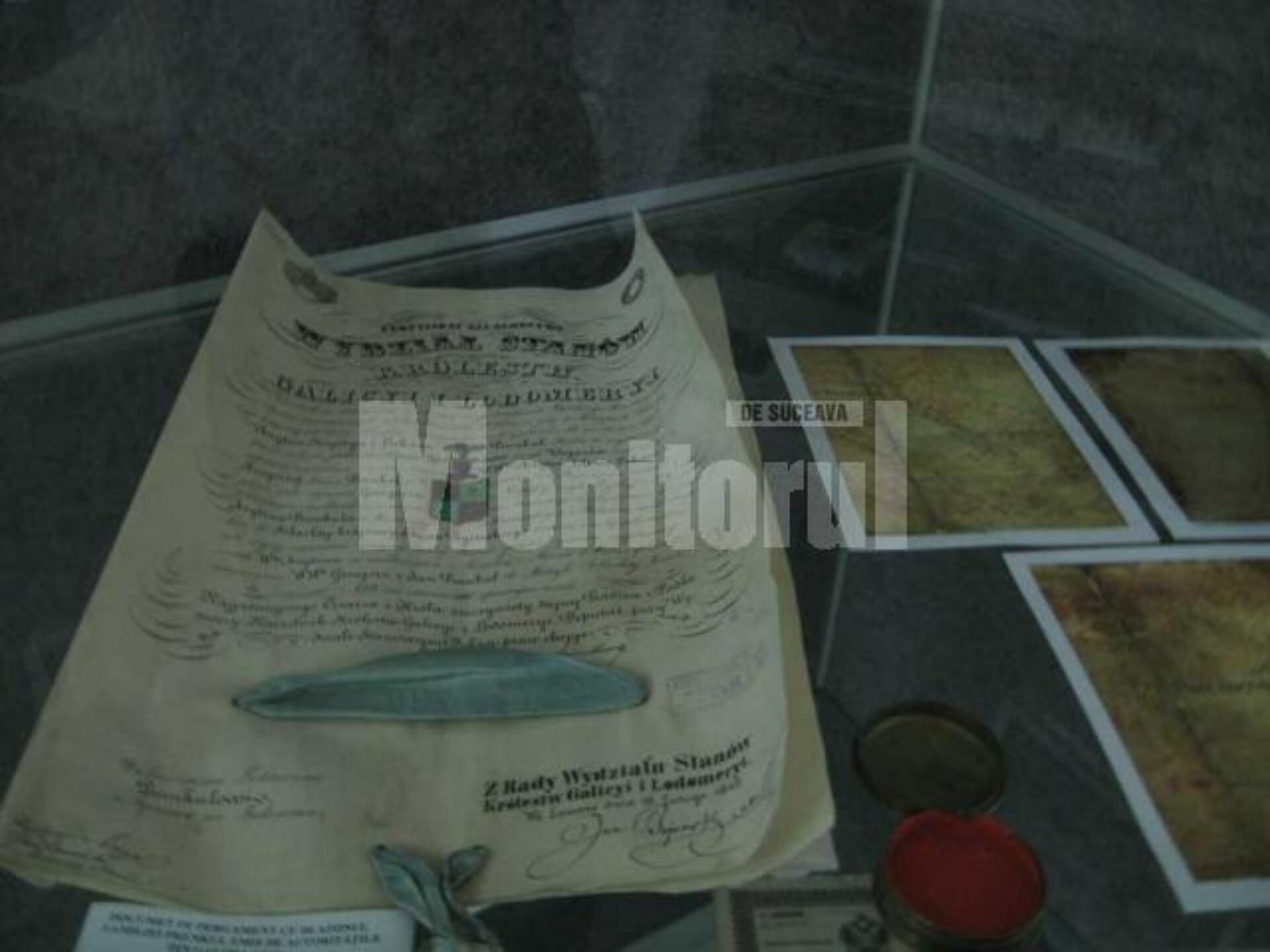 Un alt segment de expoziție prezintă o serie de documente (cum este pergamentul cu blazonul familiei Prunkul, emis de administrația galițiană în anul 1849), hărți și albume cu fotografii, sigilii din perioada habsburgică a Sucevei, dar și câteva obiecte de epocă: un samovar și o lampă cu petrol din alamă, o balanță farmaceutică sau o veche mașină de scris „Adler”.