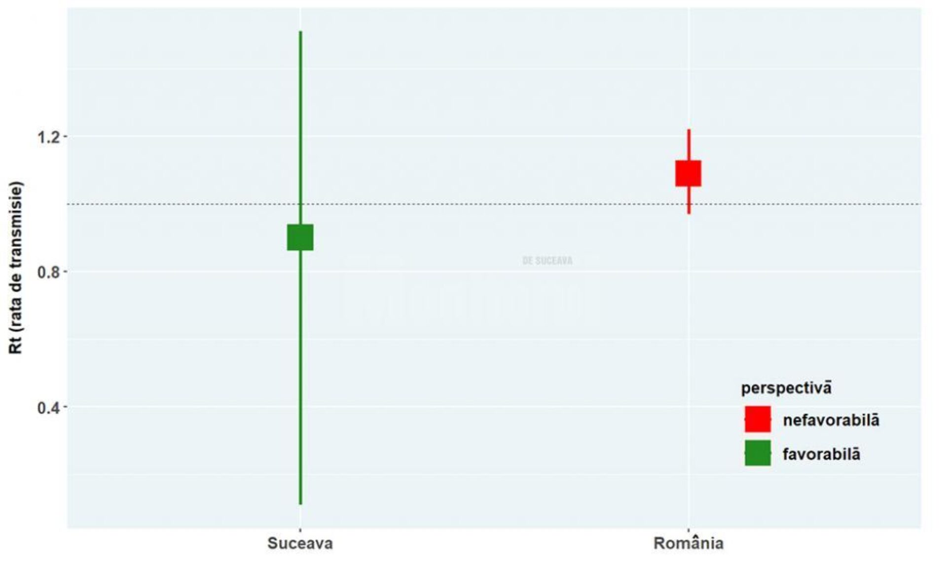 O analiză mai avansată a datelor existente poate genera și o estimare a ratei efective de transmitere a virusului (Rt) la nivel județean și național, indicator folosit și în țările din vestul Europei și din America de Nord pentru a determina perspectiva de evoluție a pandemiei. Intuitiv, rata de transmitere Rt reprezintă numărul mediu de pacienți infectați de la un singur caz, putând astfel estima că o rată de transmitere supraunitară indică perspectiva de creștere a epidemiei, o rată de transmisie subunitară indică faptul că epidemia se află în scădere. O rată de transmisie apropiată de 1 indică o anumită perspectivă neutră în ce privește evoluția epidemiei. Așa cum se poate observa din Figura 2, județul Suceava are în acest moment o perspectivă favorabilă, în timp ce pe plan național se înregistrează o perspectivă nefavorabilă, de extindere a răspândirii epidemiei dacă nu se folosesc măsuri de protecție suplimentare celor prezente.