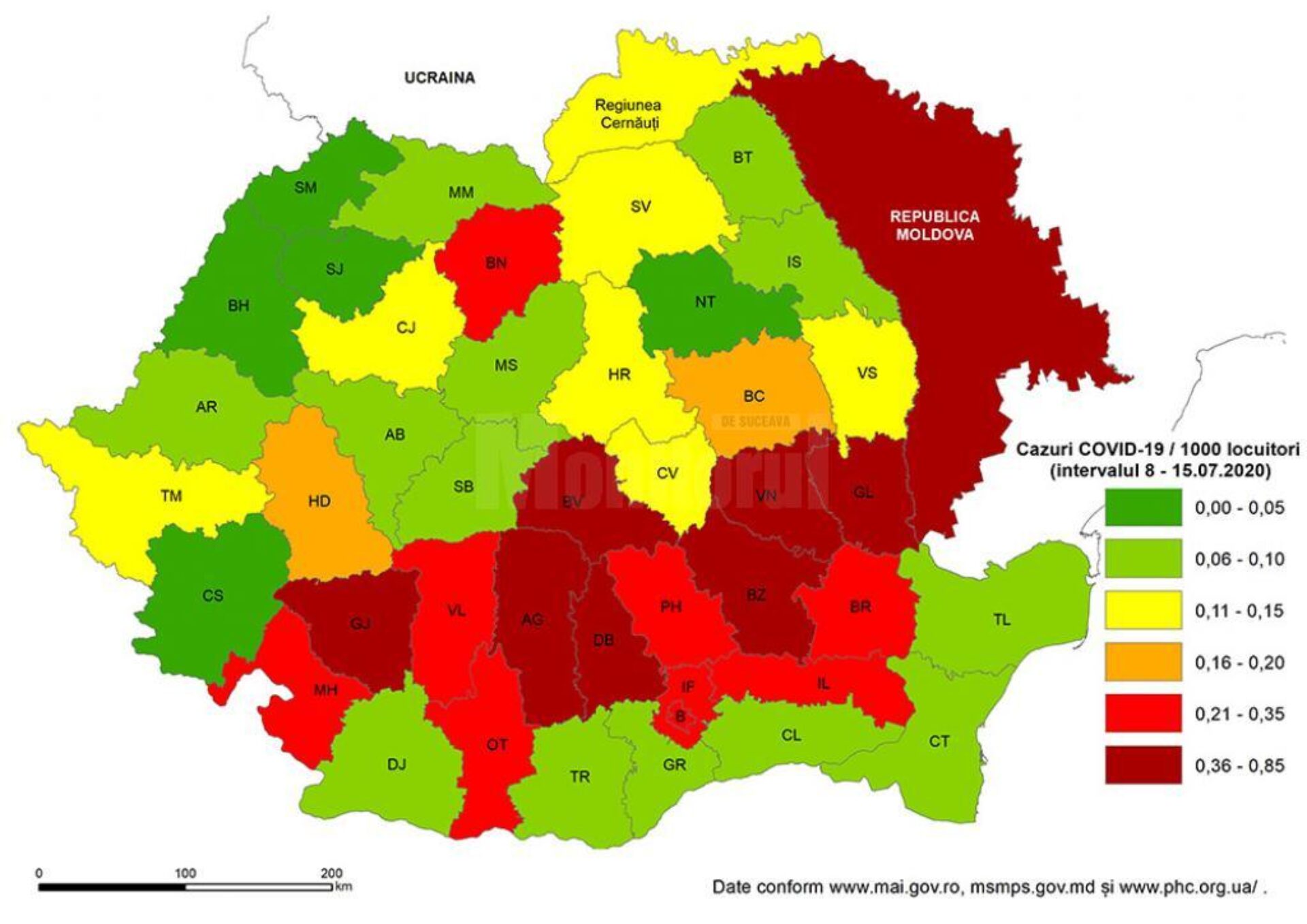 Situația Sucevei este semnificativ sub media națională, la nivelul întregii țări înregistrându-se un număr de 21 cazuri noi la 100.000 de locuitori. Astfel, deși păstrează în continuare primul loc în ce privește numărul total de cazuri diagnosticate pozitiv de la începutul acestei pandemii, județul Suceava a coborât constant în clasamentul național în ce privește numărul de cazuri noi, ajungând la statutul de zonă relativ sigură, în timp ce situația s-a agravat semnificativ în regiunea de sud a țării. Pentru a oferi o imagine actualizată a situației epidemiologice la nivel național, prezentăm mai jos distribuția pe județe a numărului de cazuri noi înregistrate la mia de locuitori din ultima săptămână (8-15 iulie), în Figura 1. Harta a fost realizată prin prelucrarea datelor oficiale publicate de Grupul de Comunicare Strategică, pe www.mai.gov.ro .