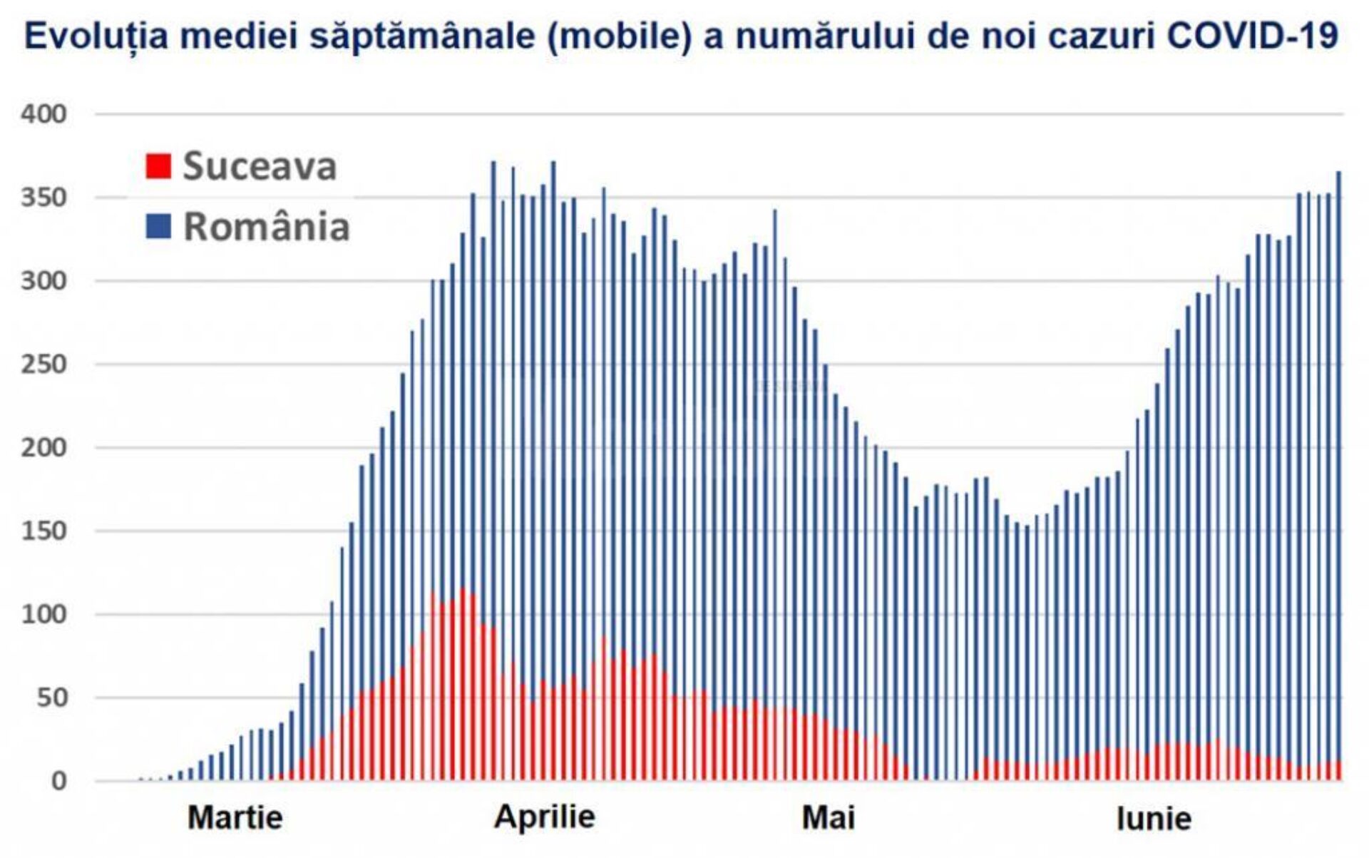 Situația Sucevei se încadrează în media națională, la nivelul întregii țări înregistrându-se 13 cazuri noi la 100.000 de locuitori. Astfel, deși păstrează în continuare primul loc în ce privește numărul total de cazuri diagnosticate pozitiv de la începutul acestei pandemii, județul Suceava a trecut pe parcursul ultimelor săptămâni de la statutul de principal focar național la o zonă relativ sigură. Acest fapt este ilustrat și în Figura 1, ce prezintă media săptămânală (mobilă) a numărului de noi cazuri COVID-19 la nivel național și la nivelul Sucevei. Observăm aici și faptul că, în contextul măsurilor de relaxare a restricțiilor de prevenire a răspândirii COVID-19 din lunile mai și iunie, România s-a apropiat de un al doilea vârf al pandemiei, similar cu cel din luna aprilie, însă acesta nu mai are județul Suceava ca principală componentă.