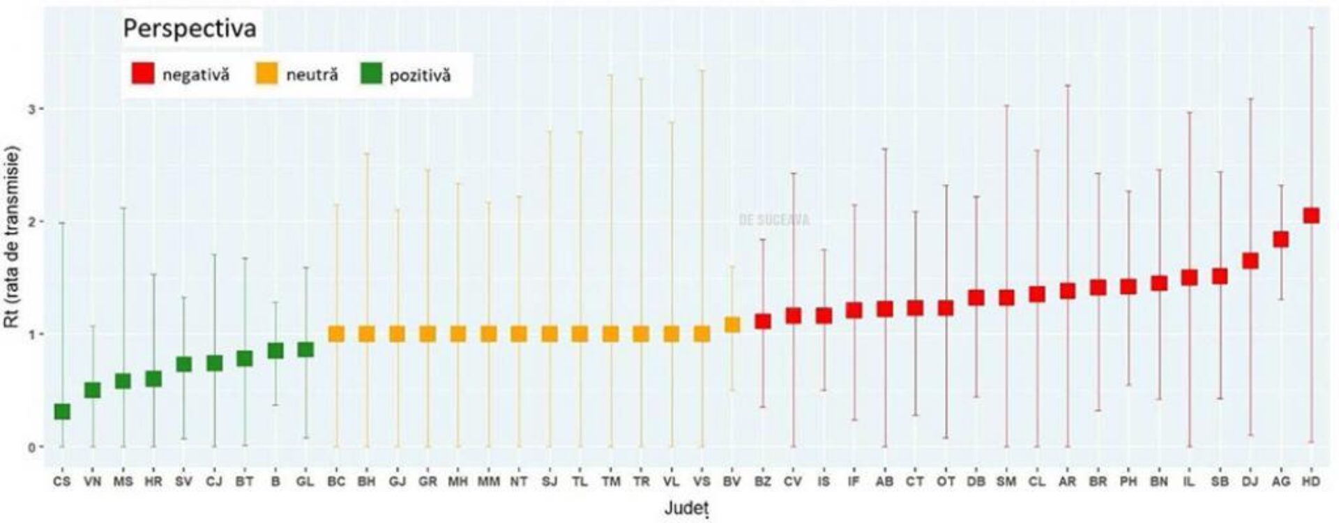 O analiză avansată a datelor existente poate genera și o estimare a ratei efective de transmitere a virusului (Rt) la nivelul județelor din România, indicator folosit și în țările din vestul Europei și din America de Nord pentru a determina perspectiva de evoluție a pandemiei. Intuitiv, rata de transmitere Rt reprezintă numărul mediu de pacienți infectați de la un singur caz, putând astfel estima că o rată de transmitere supraunitară indică perspectiva de creștere a epidemiei, o rată de transmisie subunitară indică faptul că epidemia se află în scădere. O rată de transmisie apropiată de 1 indică o anumită perspectivă neutră în ce privește evoluția epidemie.