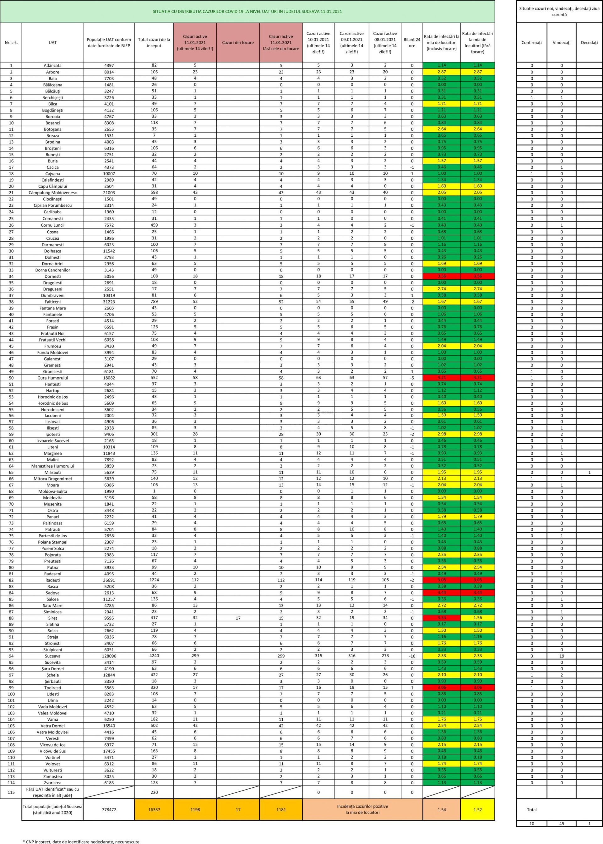 Cele mai multe cazuri de Covid-19 în evoluție în județ, la această dată, se înregistrează în municipiul Suceava, 299, localitate care are și cel mai mare număr de locuitori. Urmează Rădăuți, cu 112 cazuri active, apoi Gura Humorului, care la 18.082 de locuitori are 58 de cazuri în evoluție, mai multe decât Fălticeni, care are 52 de cazuri la 31.223 de locuitori, Câmpulung Moldovenesc – 43 de cazuri active la 21.003 locuitori sau Vatra Dornei, cu 42 de cazuri active la 16.540 de locuitori. În cazul comunelor, un număr mare de cazuri în evoluție se înregistrează la Ipotești – 28 la 9.406 locuitori, Șcheia – 27 de cazuri la 12.844 de locuitori, Arbore – 23 de cazuri active la o populație de 8.014 locuitori, Dornești – 18 cazuri, 5.056 de locuitori, Todirești -17 cazuri și 5.563 de locuitori și Vicov de Jos – 15 cazuri și o populație de 6.977 de locuitori. Numărul total al cazurilor active în județ la data de 11 ianuarie este de 1.198.