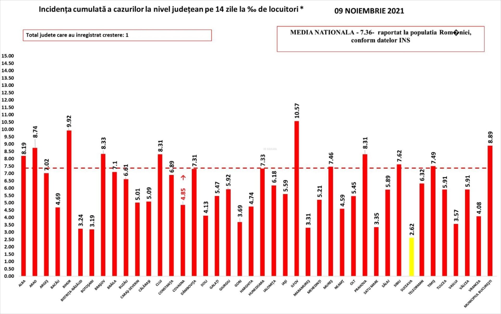 Incidența cazurilor Covid-19 în județul Suceava continuă să scadă, de la 2,76 la mia de locuitori luni, la 2,62 la mia de locuitori, marți, județul nostru menținându-se singurul din țară care a ieșit din zona roșie a incidenței, de 3 la mie, în acest val 4 al pandemiei. Marți în județ s-au înregistrat 110 cazuri noi de infectare cu SARS-CoV-2 și 38 de persoane reconfirmate pozitiv la retestare, din 1598 de persoane testate. În intervalul 8-9 noiembrie a.c., 9 suceveni au murit din cauza Covid. În același interval de timp, în spitalele din județ s-au internat 26 de persoane cu Covid și au fost externate 44 de persoane.