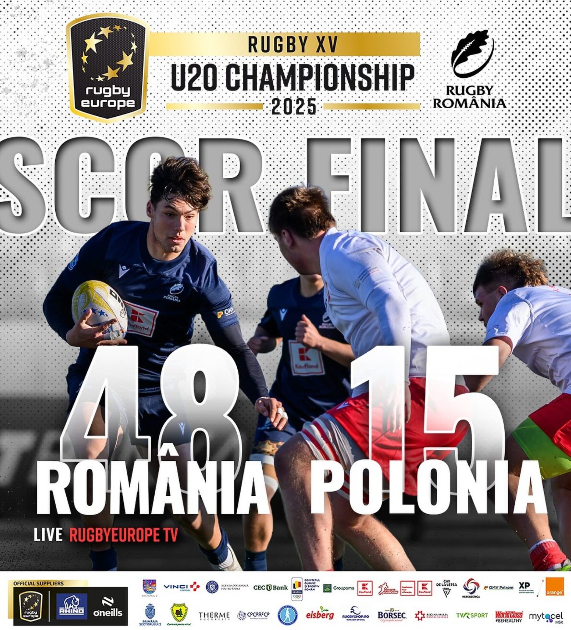 Naționala de rugby a României a reușit o victorie frumoasă, miercuri, la Campionatul European de rugby U 20, învingând Polonia cu scorul de 48-15.