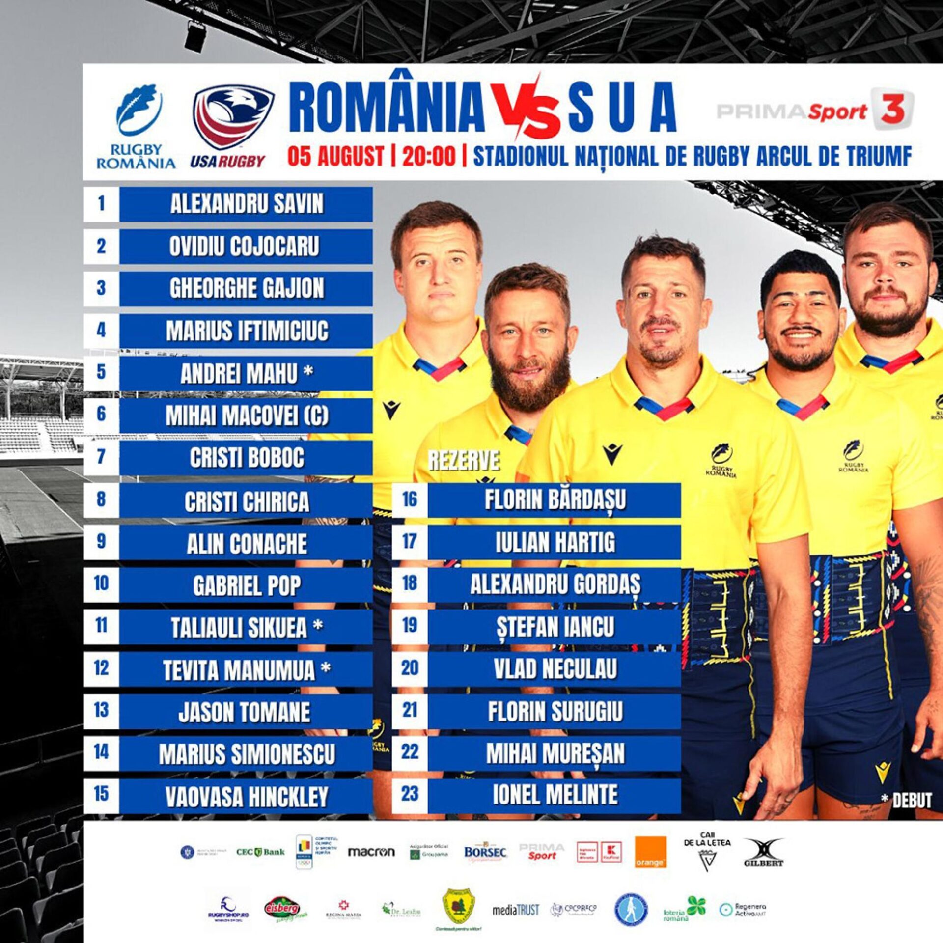Naționala de rugby a României joacă sâmbătă, 5 august, pe Stadionul Național Arcul de Triumf din București, unul din meciurile test premergătoare Cupei Mondiale de Rugby, în compania Statelor Unite ale Americii. Meciul va începe de la ora 20.00 și va fi transmis în direct de Prima Sport 3.