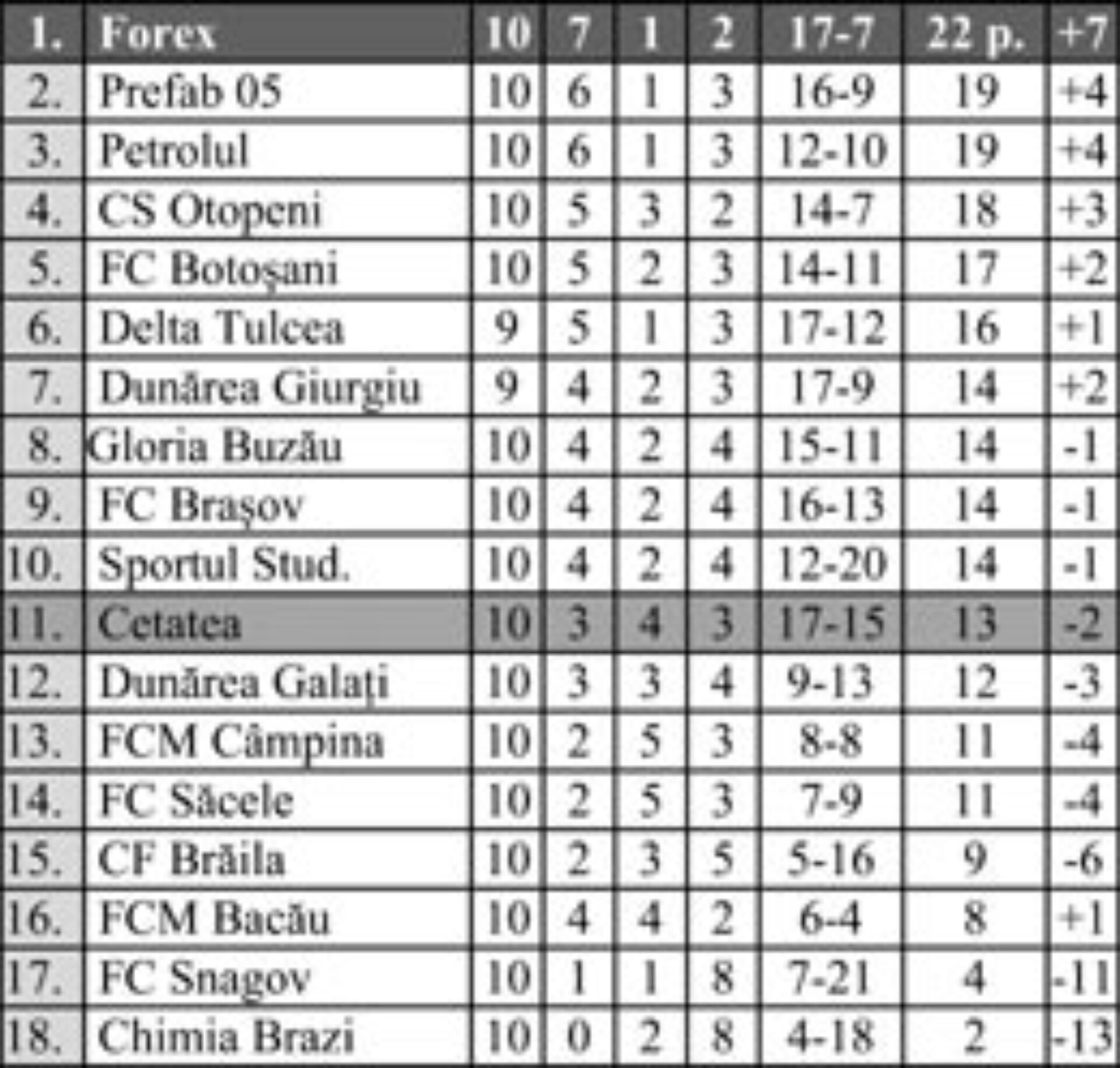Într-un meci contând pentru etapa a XI-a a Ligii secunde, Cetatea va întâlni pe teren propriu formația FCM Câmpina. Aflat la primul meci de campionat pe Areni ca antrenor al FC Cetatea, Florin Cristescu speră să întrerupă seria fără victorie a grupării sucevene ce datează de o lună și jumătate, de la victoria cu 4-2 repurtată în fața formației Delta Tulcea. Cu toate că are destule probleme de lot, Florin Cristescu speră ca jucătorii să confirme creșterea de formă arătată în meciul din runda precedentă de la Brașov, cu Forex. Dacă despre absențele lui Berezoschi, suspendat, Pelin și Cososchi, accidentați, se știa de mai multă vreme, la antrenamentul de ieri dimineață s-a accidentat destul de grav și portarul Mihai Luca. În timpul unui joc școală, internaționalul de juniori s-a ciocnit violent cu coechipierul său Florin Plecanciuc, și s-a ales cu nasul fracturat. „Din păcate fotbaliștii noștri par să joace cu mai multă ardoare la antrenamente decât în meciurile oficiale. Accidentarea lui Luca este mult mai serioasă decât s-a crezut inițial, așa că cel mai probabil îl vom trimite să se opereze la o clinică de specialitate din București. Pentru a lua cea mai bună decizie în acest caz, mă voi consulta și cu directorul loturilor naționale de juniori, Miodrag Belodedici”, a declarat președintele FC Cetatea, Dumitru Moldovan. Nici Dorian Andronic nu a avut o zi prea fericită ieri. Fundașul central în vârstă de 17 ani a fost chinuit de un abces dentar, astfel încât a ajuns pe mâna medicului stomatolog. „În ciuda acestor probleme, eu sunt încrezător că vom obține cele trei puncte atât de dorite. Sper ca publicul să fie alături de noi pe toată durata întâlnirii, pentru că sunt sigur că meciul cu câmpinenii va fi foarte dificil”, a precizat antrenorul Florin Cristescu.