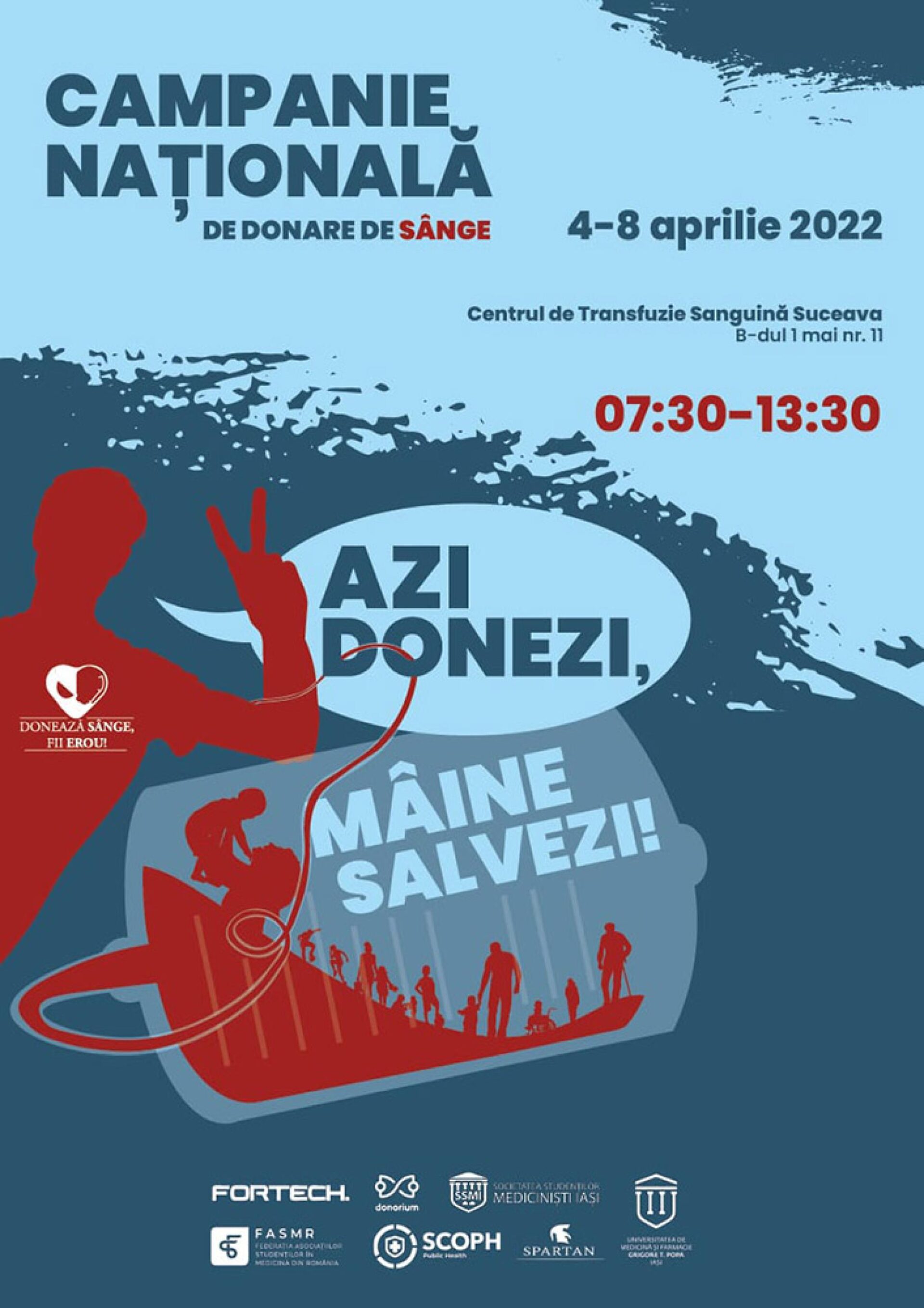 Sucevenii pot să doneze sânge, în perioada 4-8 aprilie 2022, în cadrul Campaniei naționale „Azi donezi, mâine salvezi!”. Sunteți așteptați la Centrul Județean de Transfuzie Sanguină Suceava, Bulevardul 1 Mai, nr. 11, Suceava 720224, de luni până vineri, între orele 07:30 și 13:30. Organizatorii campaniei de pe plan local, eveniment intitulat „Donează sânge, fii erou!”, promit multe surprize pentru donatori oferite de partenerii Fortech și Spartan.