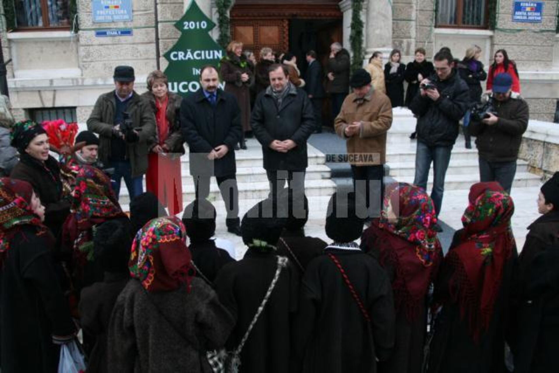 De acolo, convoiul Moșilor Crăciun a plecat la Consiliul Județean și la Prefectură, unde au transmis urările lor pentru Crăciun și Anul Nou autorităților județene. De la Consiliul Județean moșii au ajuns la Primăria municipiului Suceava și l-au colindat pe primarul Ion Lungu.