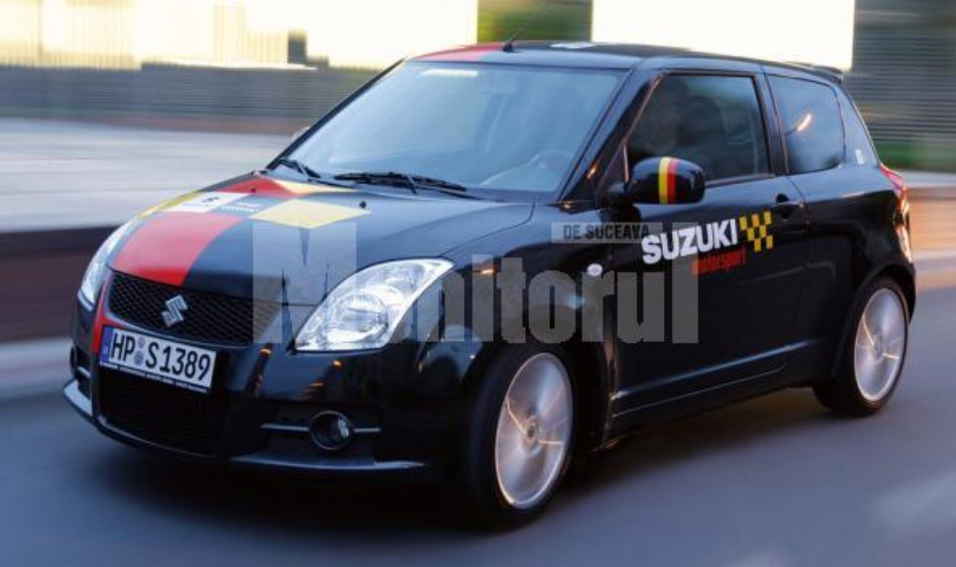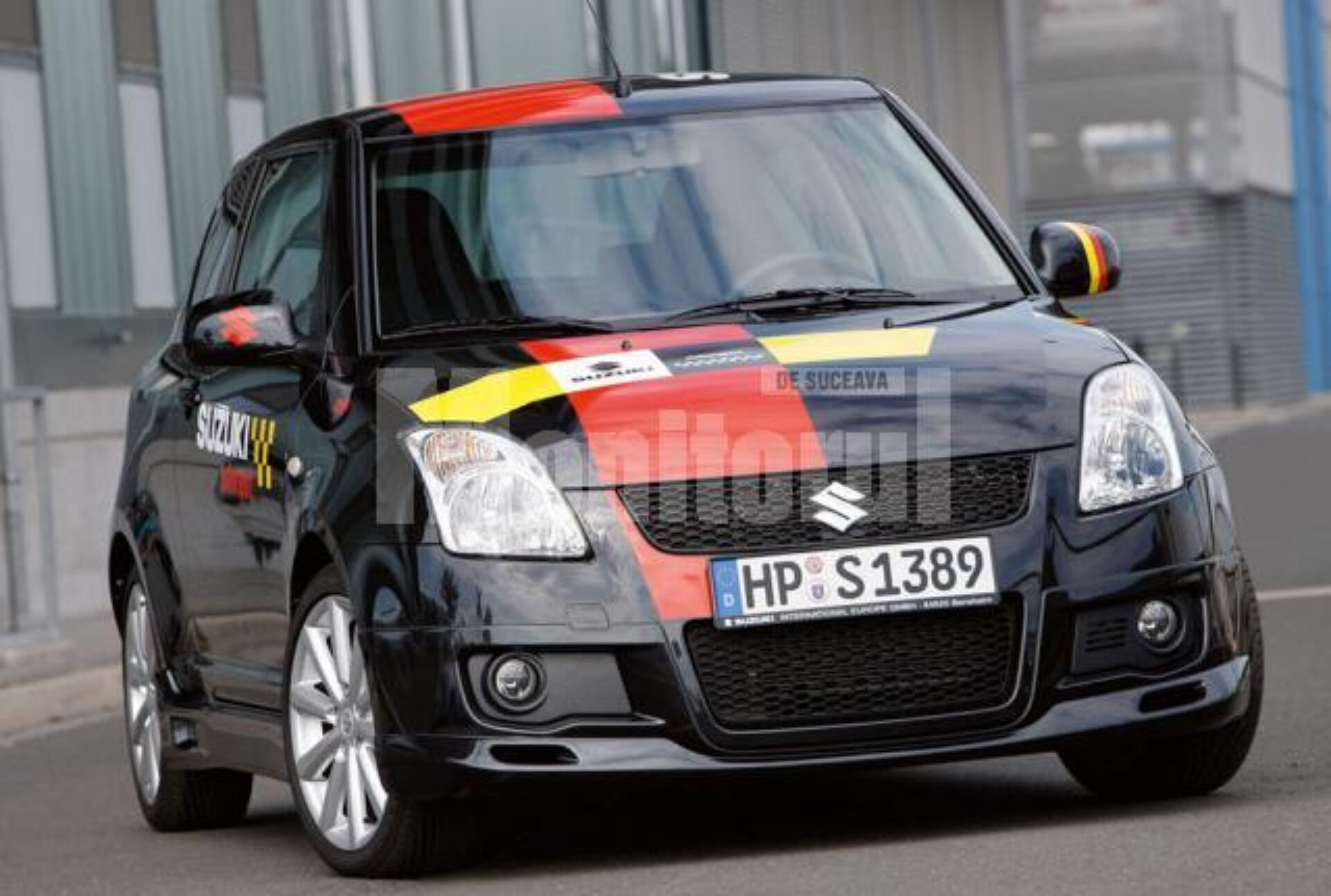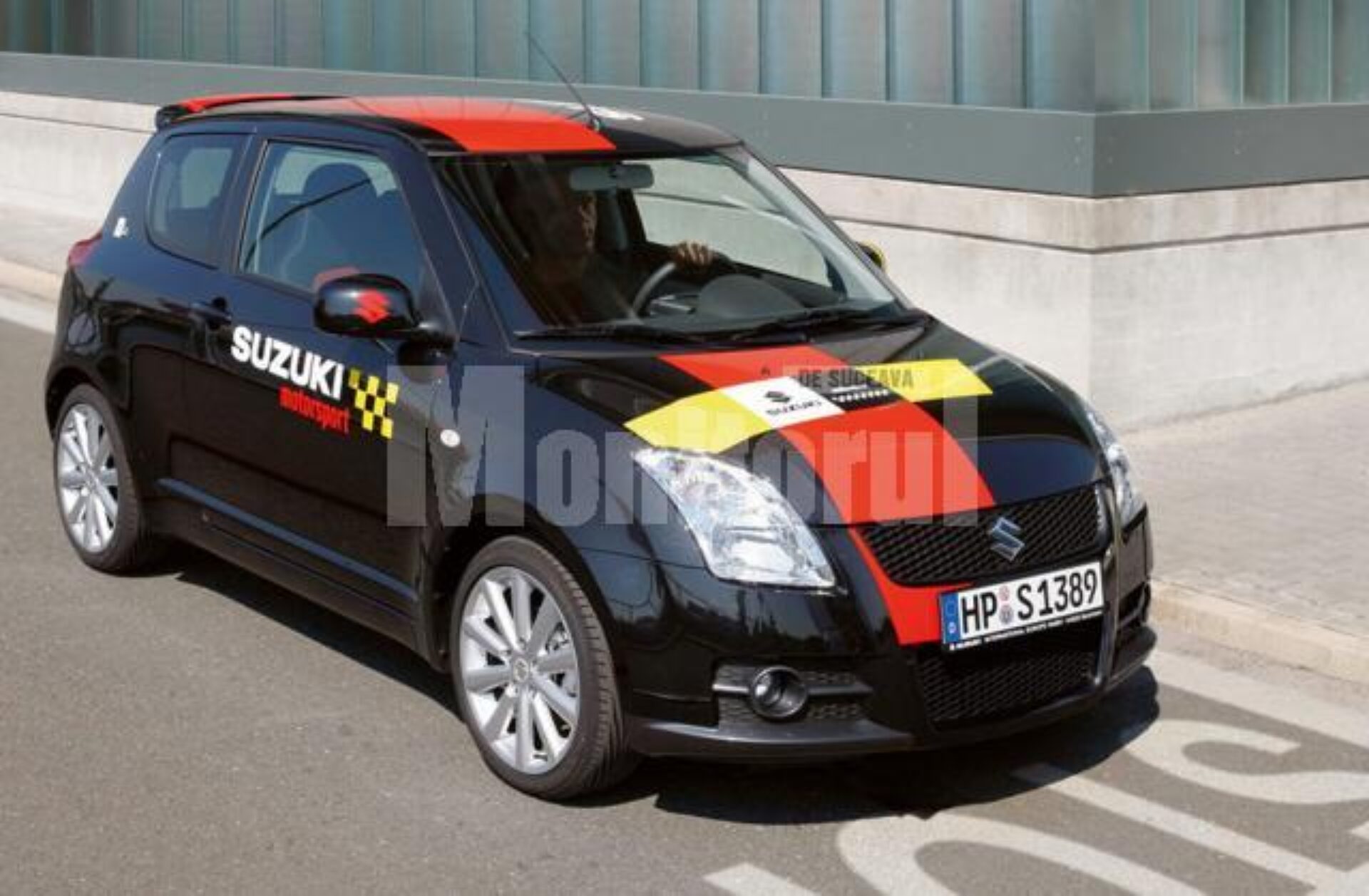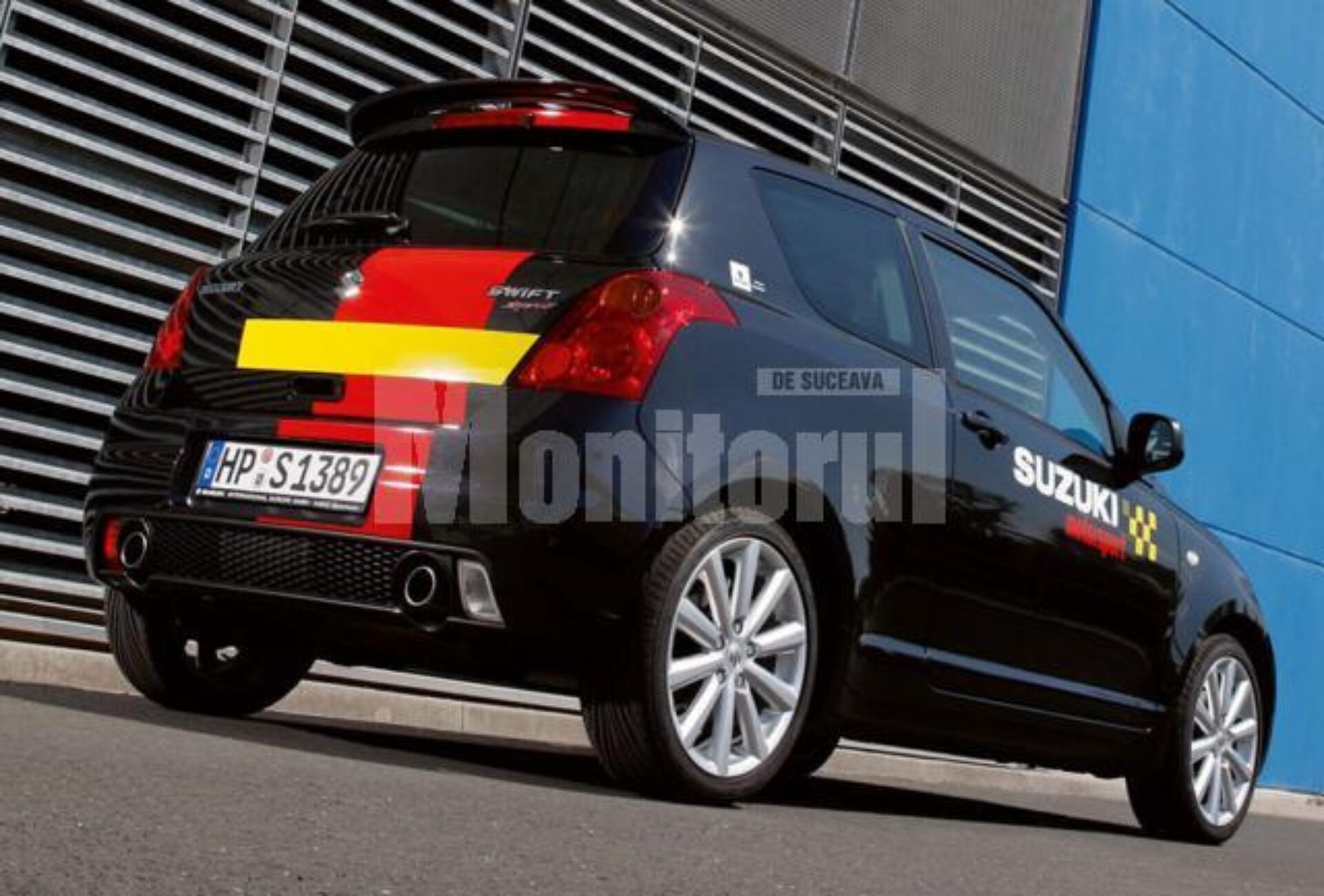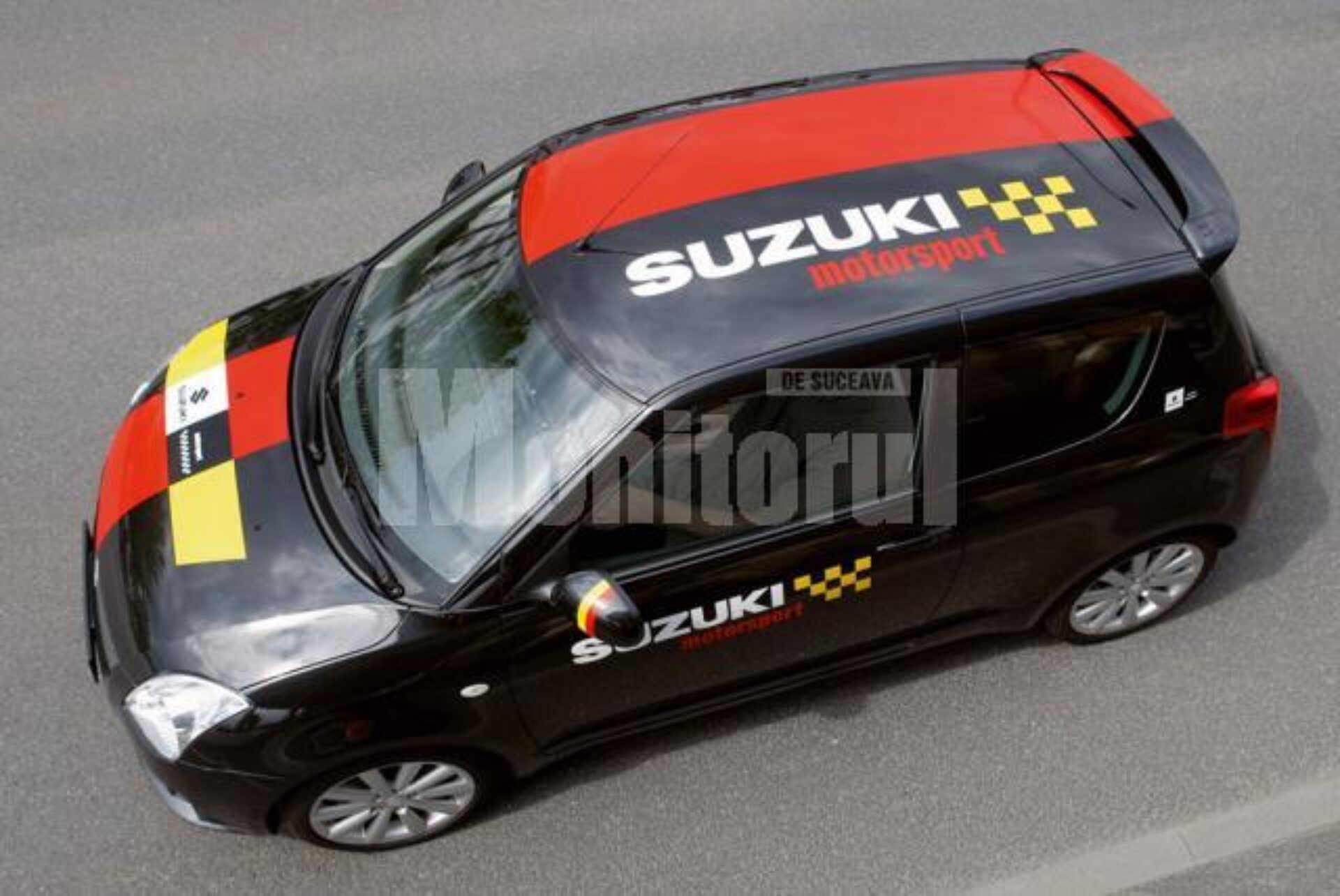 Disponibilă doar în culoare neagră, caroseria personalizată cu marcaje roșii și galbene diferă de modelul domestic Swift printr-o serie de modificări specifice unei mașini de curse.