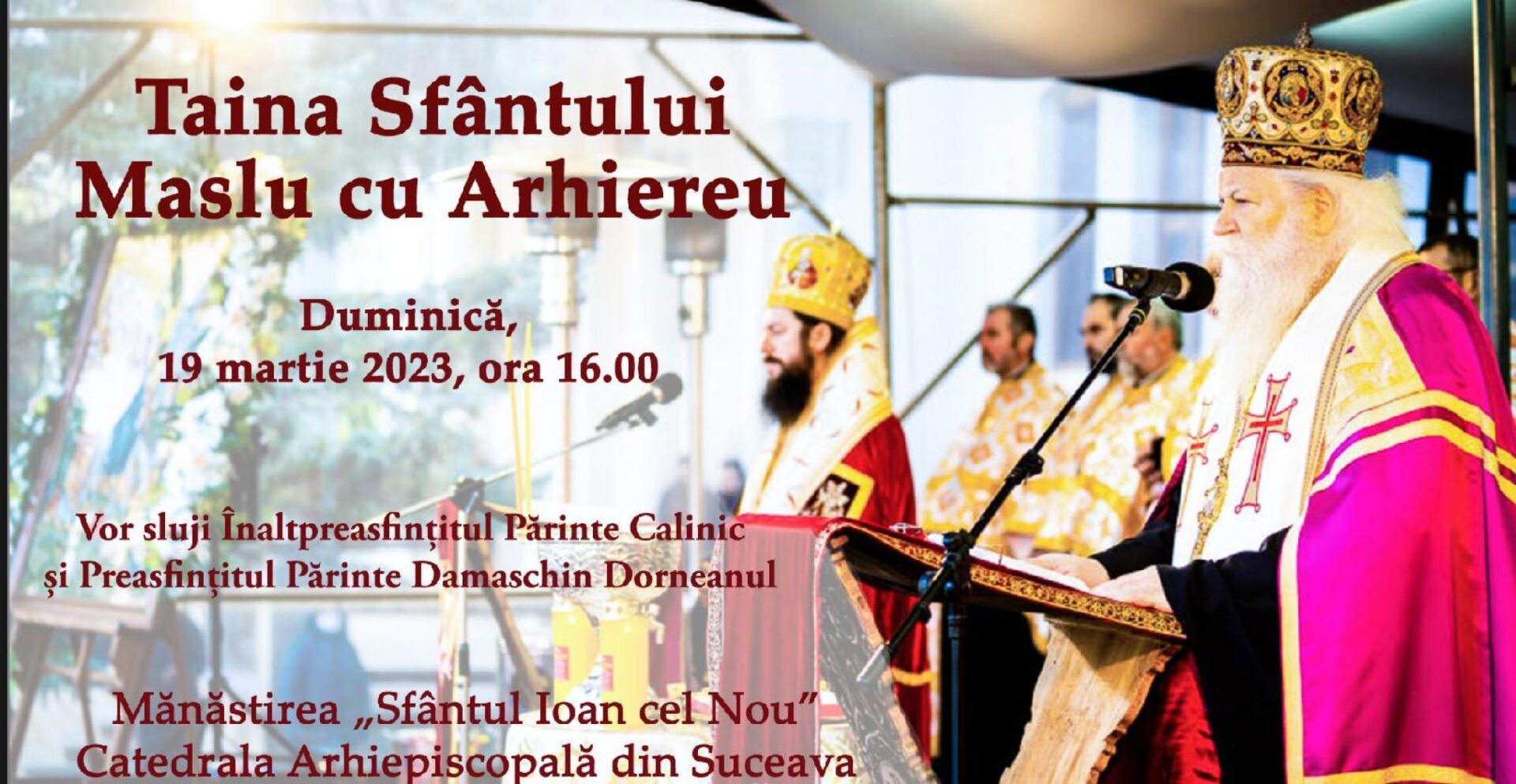 La Mănăstirea „Sfântul Ioan cel Nou” – Catedrala Arhiepiscopală din Suceava va avea loc duminică, 19 martie 2023, în Duminica a III-a din Post – Duminica Sfintei Cruci,începând cu ora 16:00, Taina Sfântului Maslu de obște, slujbă săvârșită de Înaltpreasfințitul Părinte Calinic, Arhiepiscop al Sucevei și Rădăuților, și de Preasfințitul Părinte Damaschin Dorneanul, Episcop-Vicar.