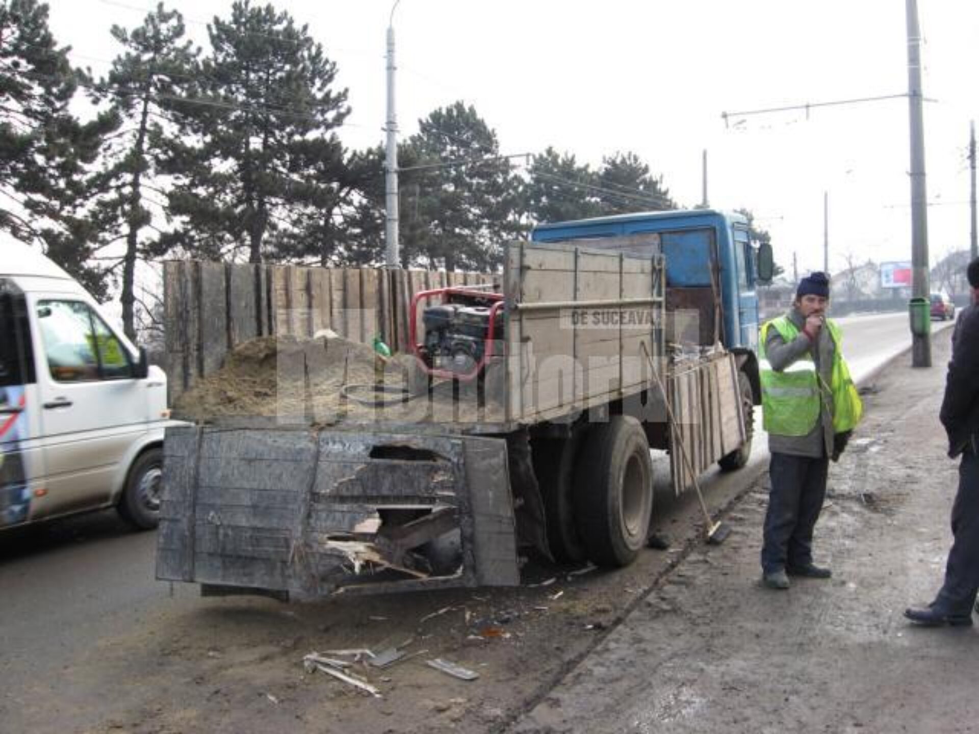 Mai întâi un camion, care transporta din loc în loc muncitorii care cârpeau cu pavele porțiuni de drum găurite pentru efectuarea unor lucrări, a fost izbit din plin de un autoturism care venea din spate. Tamponarea s-a produs pe banda I de mers, pe direcția Burdujeni-Suceava.