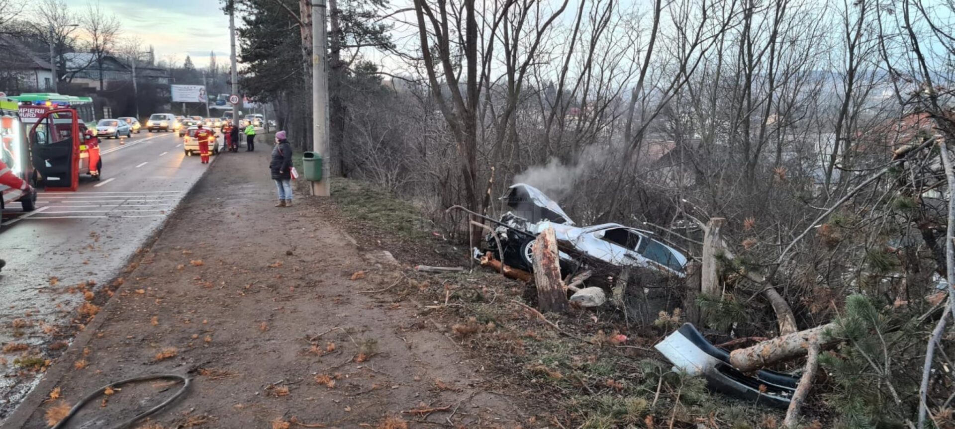 Un grav accident s-a petrecut joi seara, înainte de ora 17.00, pe strada Calea Unirii din Suceava, mai sus de Grupul Școlar. Un autoturism Mercedes condus de un tânăr de 23 de ani, din municipiul Suceava, a fost scăpat de sub control, a părăsit șoseaua și a intrat în coliziune violentă cu arborii de la marginea drumului. În urma coliziunii puternice cu copacii, se pare că șoferul a fost proiectat în afara mașinii, fiind astfel găsit de echipele de salvare ajunse la fața locului. În același timp, în momentul părăsirii părții carosabile, autoturismul a acroșat un pieton, un bărbat de 40 de ani care se afla pe trotuar. După ieșirea în decor, la partea din față a mașinii a izbucnit un incendiu.