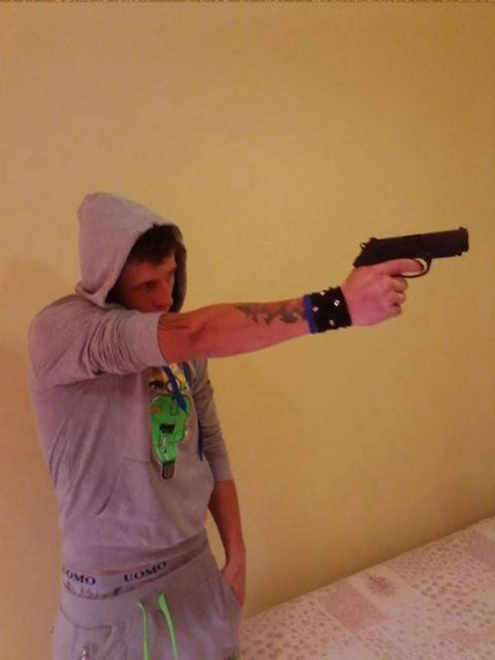 Acesta și-a confecționat singur arma, plecând de la un cartuș pentru pistol și un cartuș pentru o armă de vânătoare, aduse din Italia. Arma a fost confecționată dintr-o țeavă metalică, un arc de la o bicicletă, o bucată de lemn și diverse șuruburi și piulițe, cu informații adunate de pe internet.