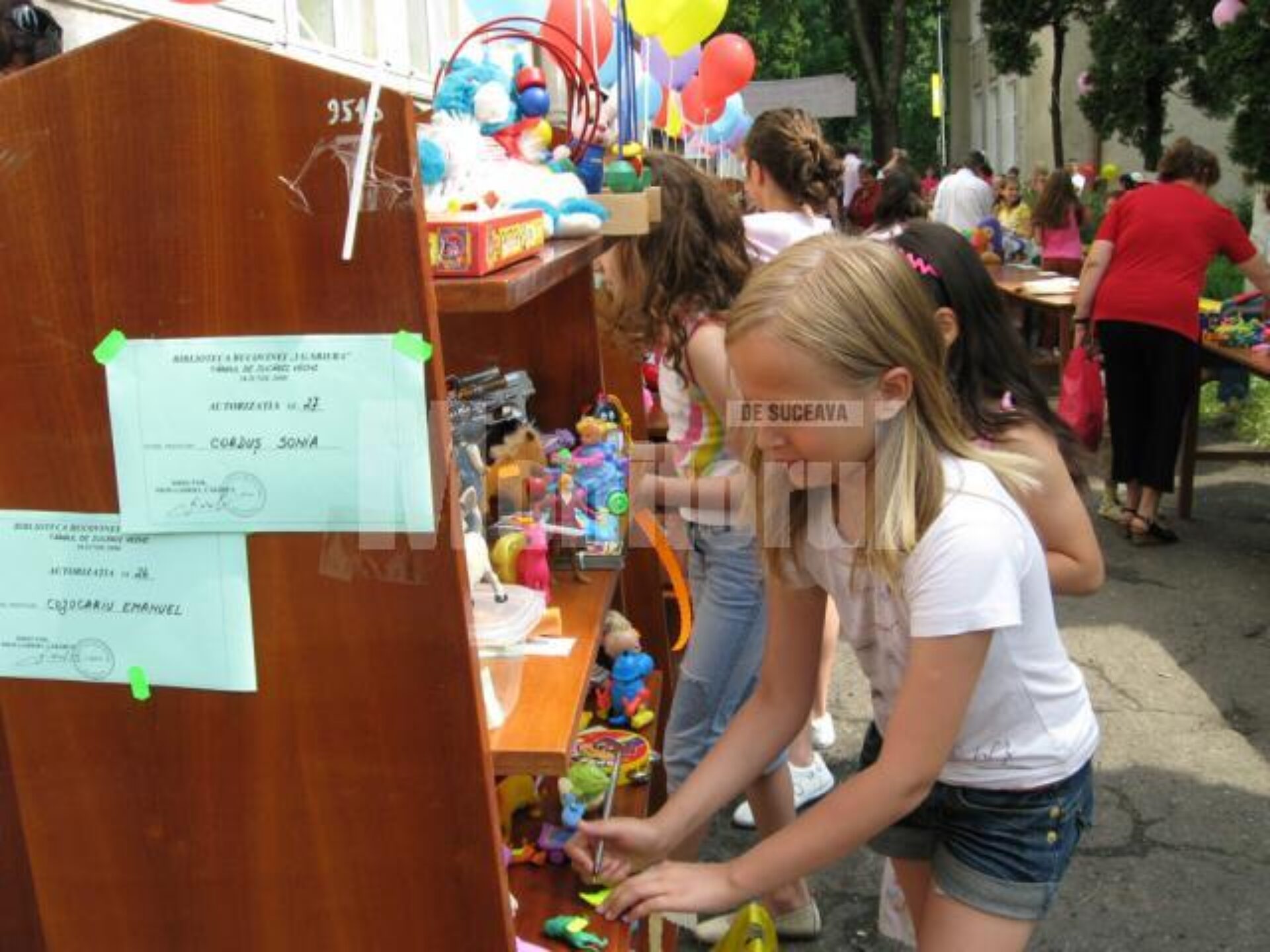 Fetițele și-au aliniat păpușile și ursuleții de pluș, băieții mașinile, armele și jocurile puzzle, pe standuri erau afișate, la vedere, „autorizațiile de vânzare” eliberate de organizatori (cu ștampila și semnătura directorului bibliotecii sucevene, prof. Gabriel Cărăbuș), părinții și bunicii inspectau târgul și supravegheau tranzacțiile.