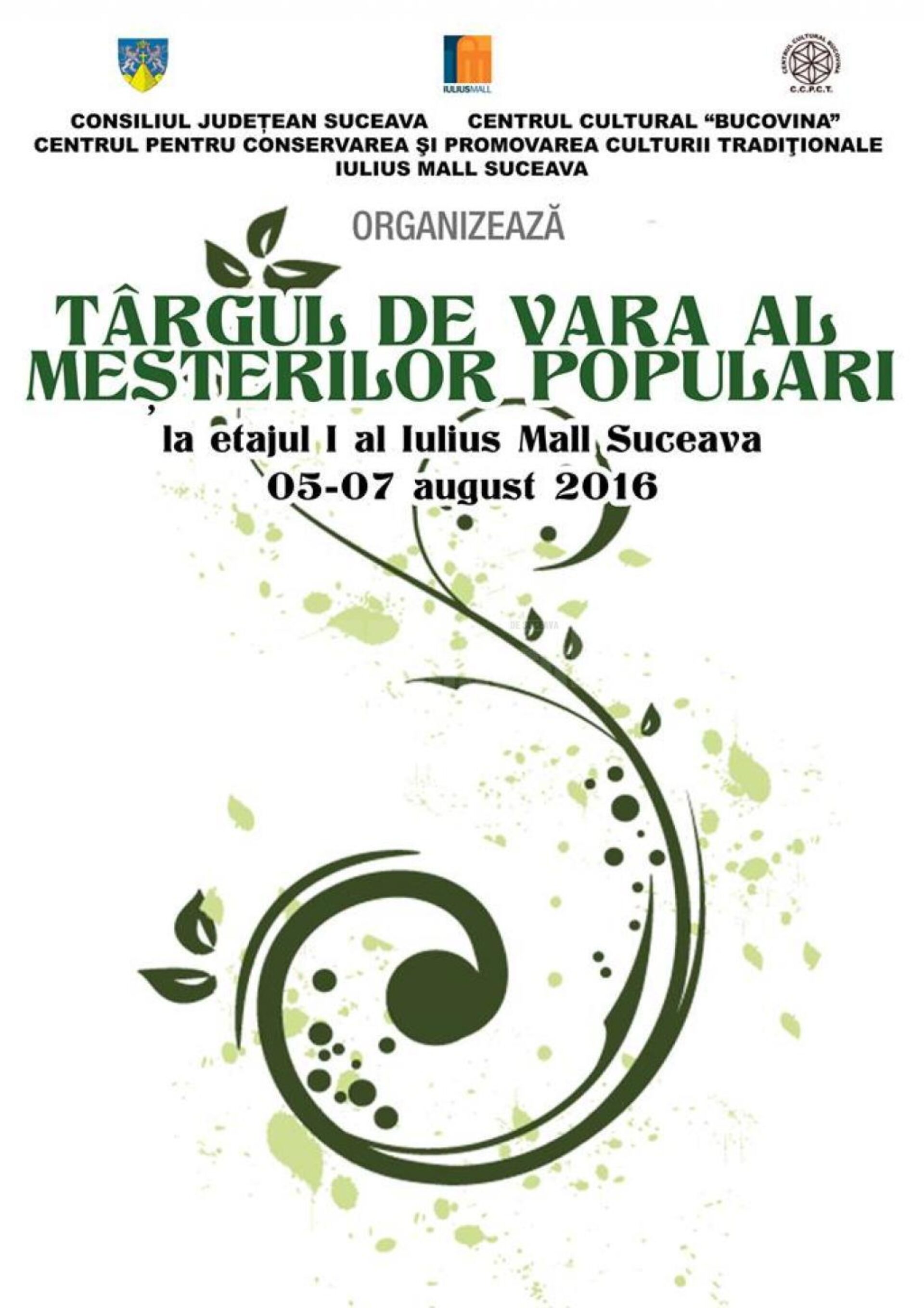 Consiliul Județean Suceava, Centrul Cultural Bucovina – Centrul pentru Conservarea și Promovarea Culturii Tradiționale și Iulius Mall Suceava organizează, în intervalul 5-7 august a.c., la etajul I al Iulius Mall Suceava, Târgul de vară al meșterilor populari, manifestare care reunește 20 de meșteri populari și artizani din județul Suceava. Oferta produselor meșteșugărești cuprinde cusături și țesături, pielărie, podoabe tradiționale, cioplituri în lemn, ceramică, ouă încondeiate, artă sacră.