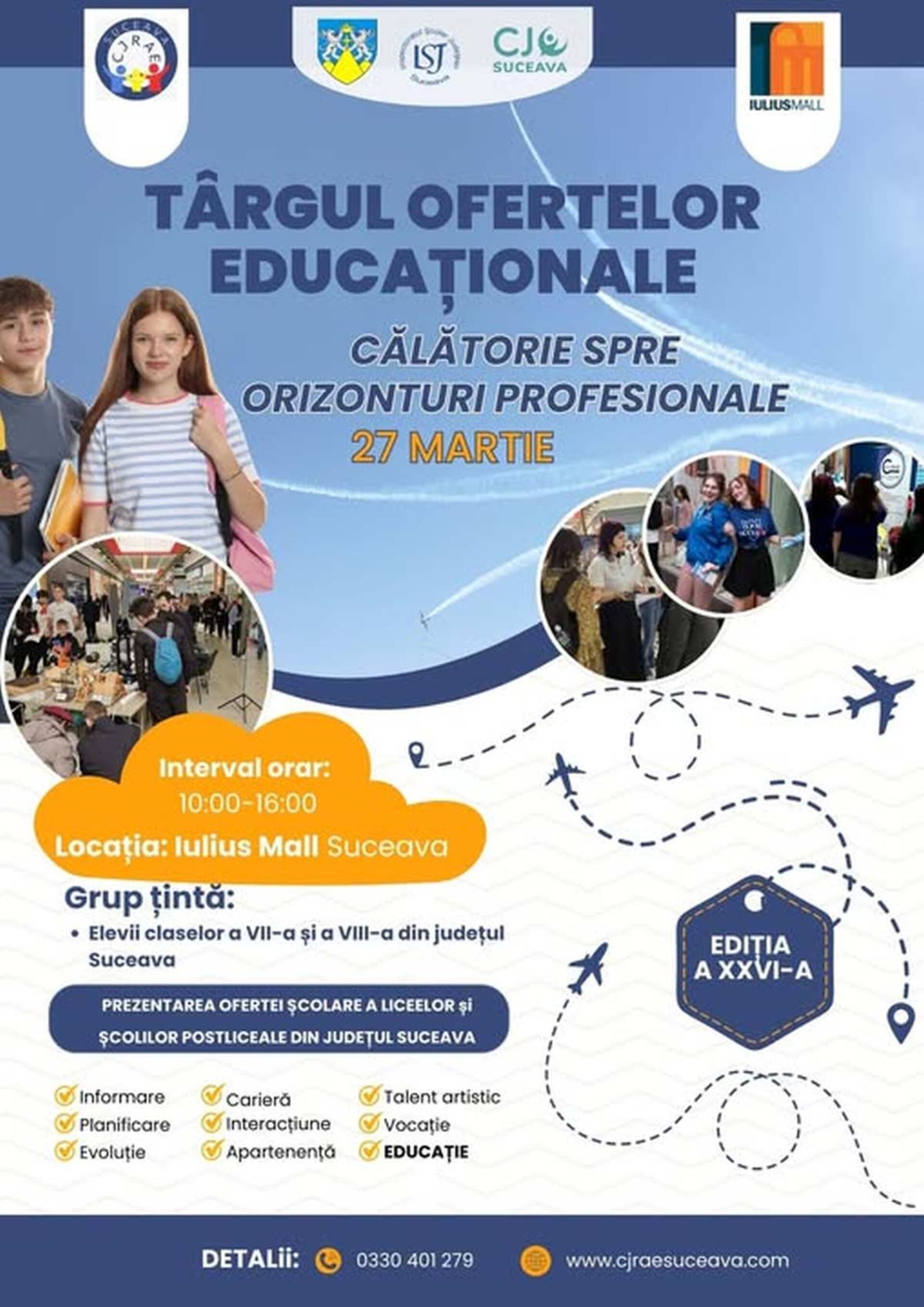 Centrul Județean de Resurse și Asistență Educațională Suceava pregătește pentru elevii claselor a VII-a și a VIII-a Târgul Ofertelor Educaționale, un eveniment dedicat orientării școlare și profesionale.