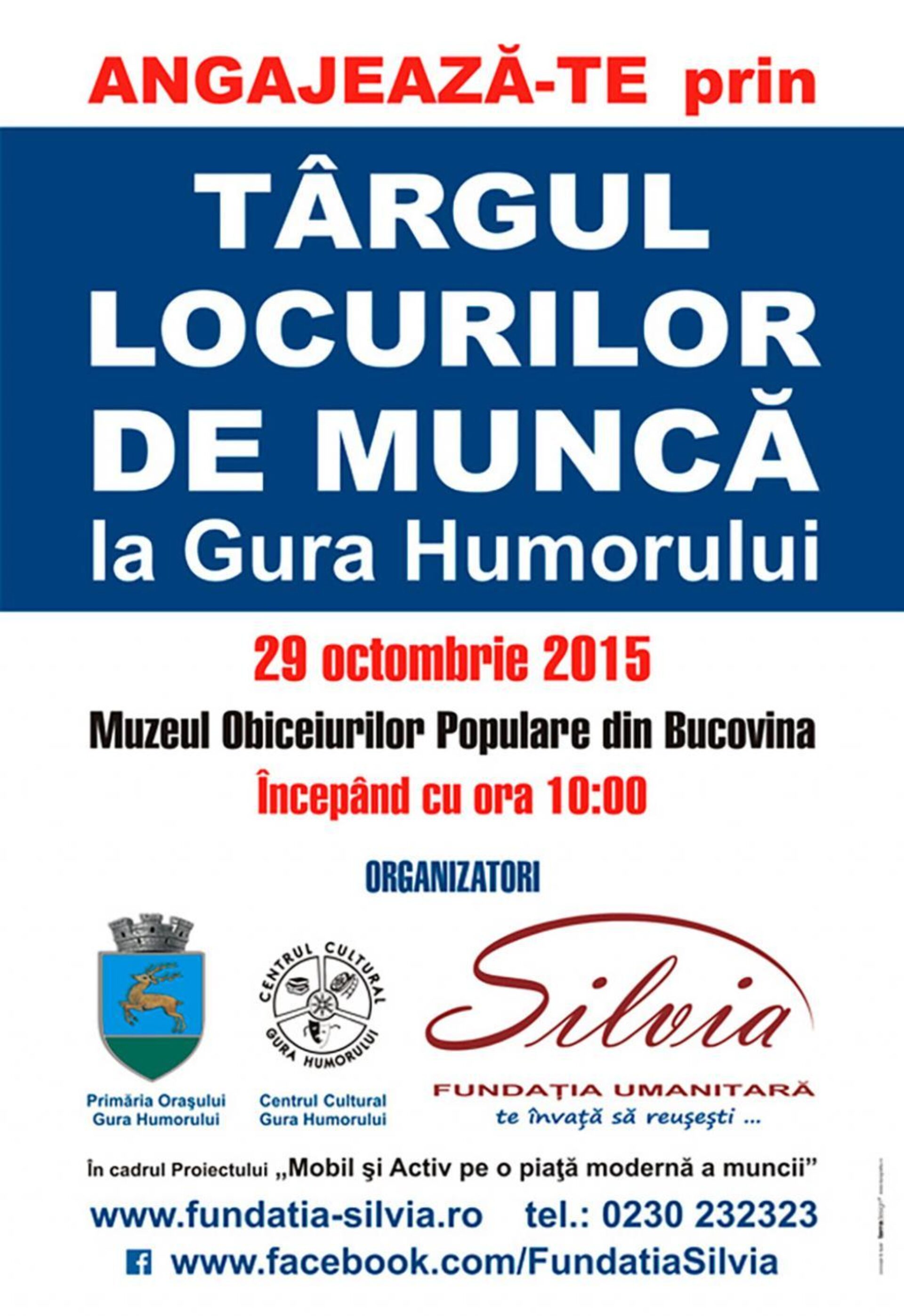 Primăria Orașului Gura Humorului, Centrul Cultural Gura Humorului și Fundația Umanitară Silvia (fundația care „te învață să reușești”) organizează joi, 29 octombrie, începând cu ora 10.00, la Muzeul Obiceiurilor Populare din Bucovina, Târgul locurilor de muncă la Gura Humorului. Acțiunea se circumscrie Proiectului „Mobil și Activ pe o piață modernă a muncii”.