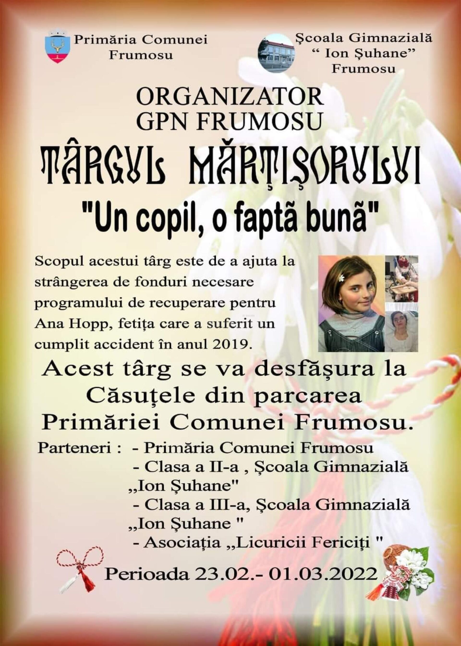 Grădinița cu Program Normal Frumosu, în parteneriat cu Școala Gimnazială „Ion Șuhane” Frumosu (clasa a II-a, clasa a III-a), Primăria comunei Frumosu, Asociația „Licuricii fericiți” Câmpulung Moldovenesc, organizează, în perioada 23 februarie – 1 martie, „Târgul mărțișorului – Un copil, o faptă bună!”, un eveniment care are drept scop strângerea de fonduri pentru Ana Hopp, o adolescentă foarte bolnavă, care a rămas cu sechele după un grav accident petrecut acum 3 ani. Târgul se desfășoară la Căsuțele din parcarea Primăriei comunei Frumosu.
