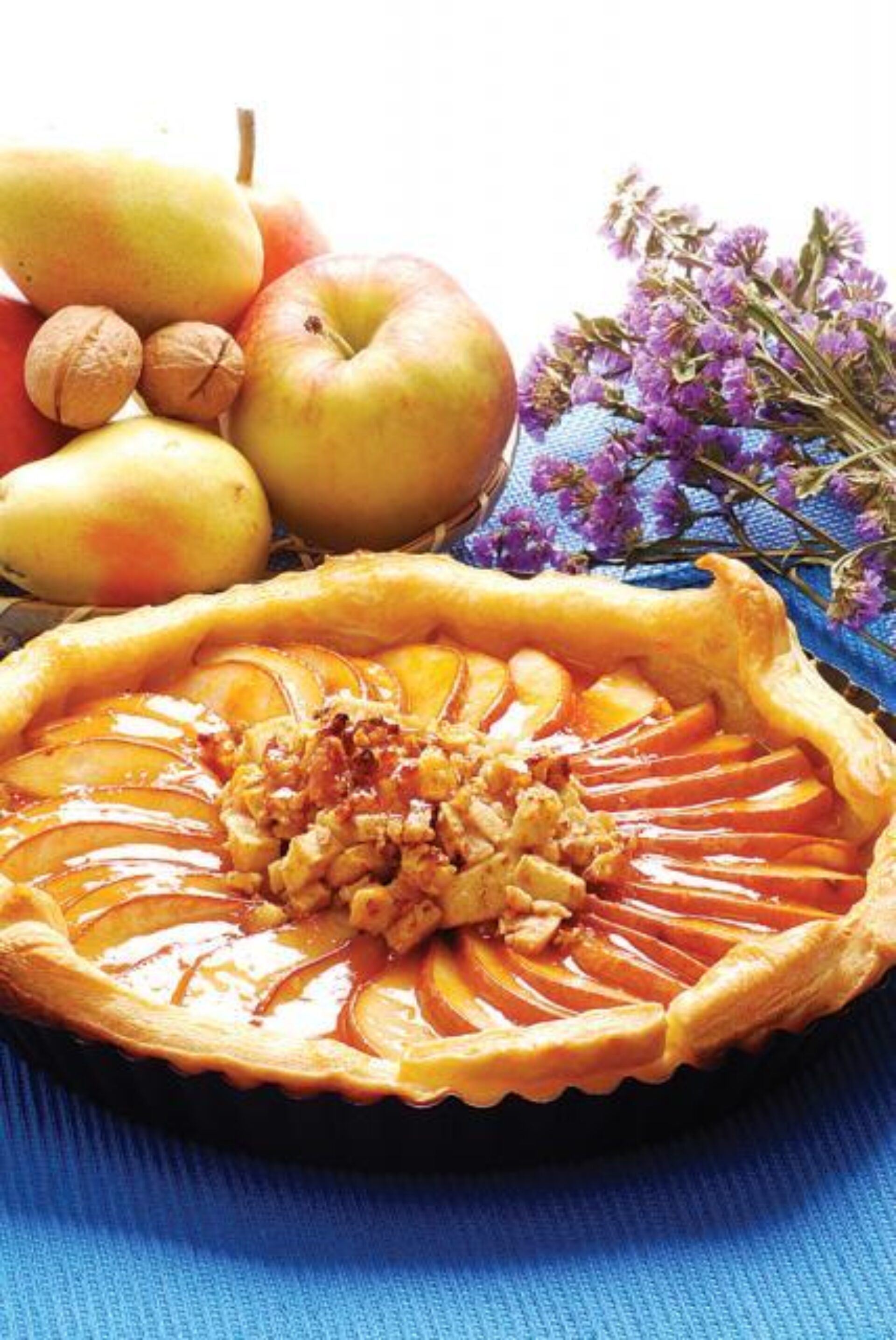 Așezați pe marginea aluatului din tavă un rând de felii de pere suprapuse puțin, în așa fel încât mijlocul să rămână liber. Tăiați merele în cubulețe și amestecați-le cu nucile zdrobite și cu 1 lingură zahăr tos. Acest amestec puneți-l în mijlocul tartei. Coaceți tarta la foc potrivit, în cuptorul încălzit dinainte. Amestecați gemul cu coniacul și turnați amestecul peste tarta fierbinte, scoasă din cuptor. Tăiați tarta în bucăți după ce se răcește 15 minute.