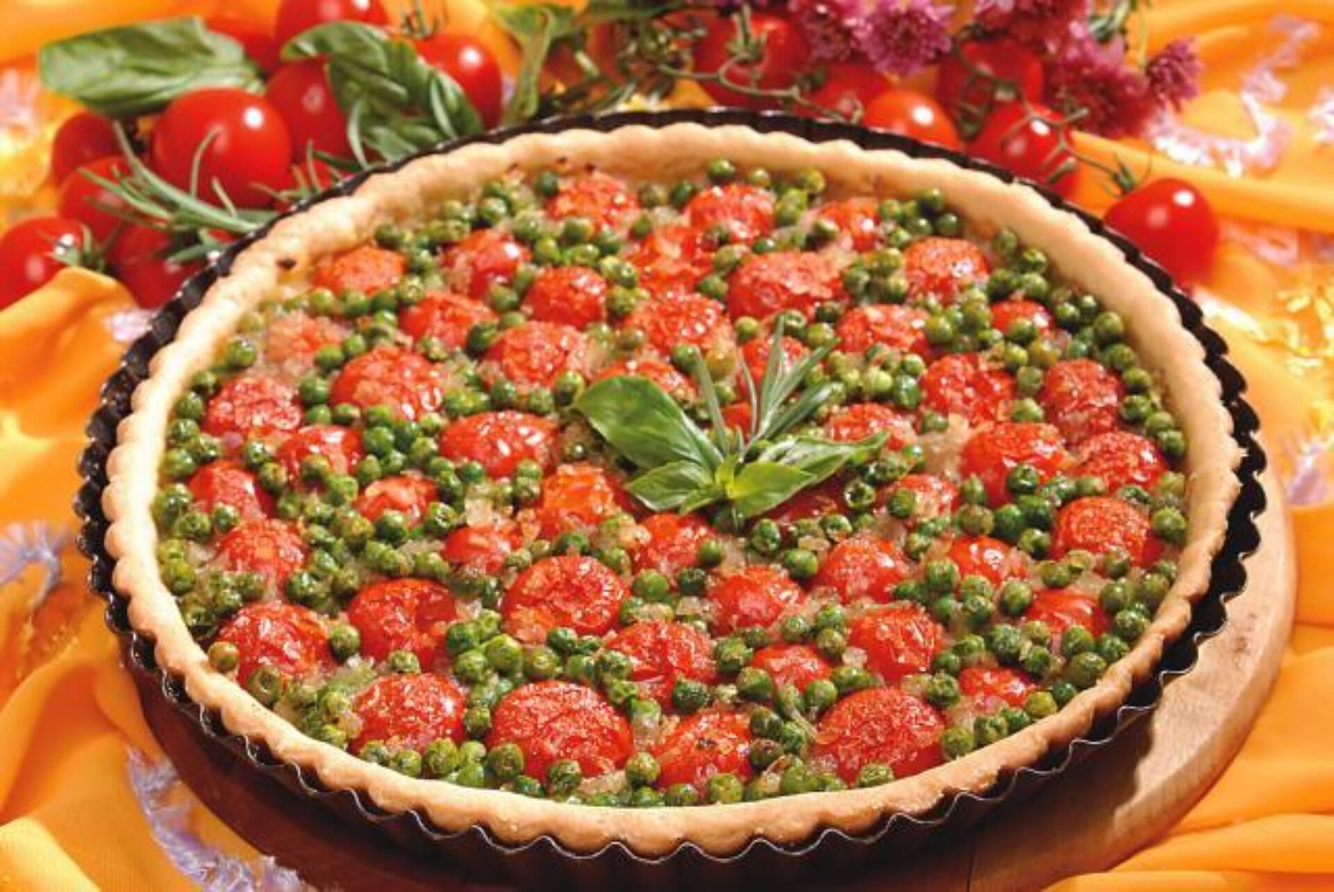 Din margarină, făină, sifon și un praf de sare frământă un aluat, apoi întinde-l într-o foaie cu grosimea de circa 5 mm. Pune foaia de aluat într-o tavă rotundă de tartă cu diametrul de 26-28cm. |nțeapă cu o furculiță aluatul din loc în loc, umple tarta cu fasole boabe (pentru a nu crește la copt) și pune tava în cuptorul încins. Coace aluatul de tartă 20-25 de minute la foc potrivit, apoi scoate boabele de fasole. Călește în ulei, la foc mic, 3-4 minute ceapa tocată mărunt, adaugă mazărea și mai lasă 5 minute pe foc. Pune pe aluatul de tartă precopt roșiile tăiate în jumătăți, apoi deasupra acestora pune mazărea din tigaie și întinde-o uniform. Presară deasupra sare și piper după gust și verdeața tocată mărunt. Pune tarta din nou la cuptor, la foc potrivit, pentru încă 20 de minute.