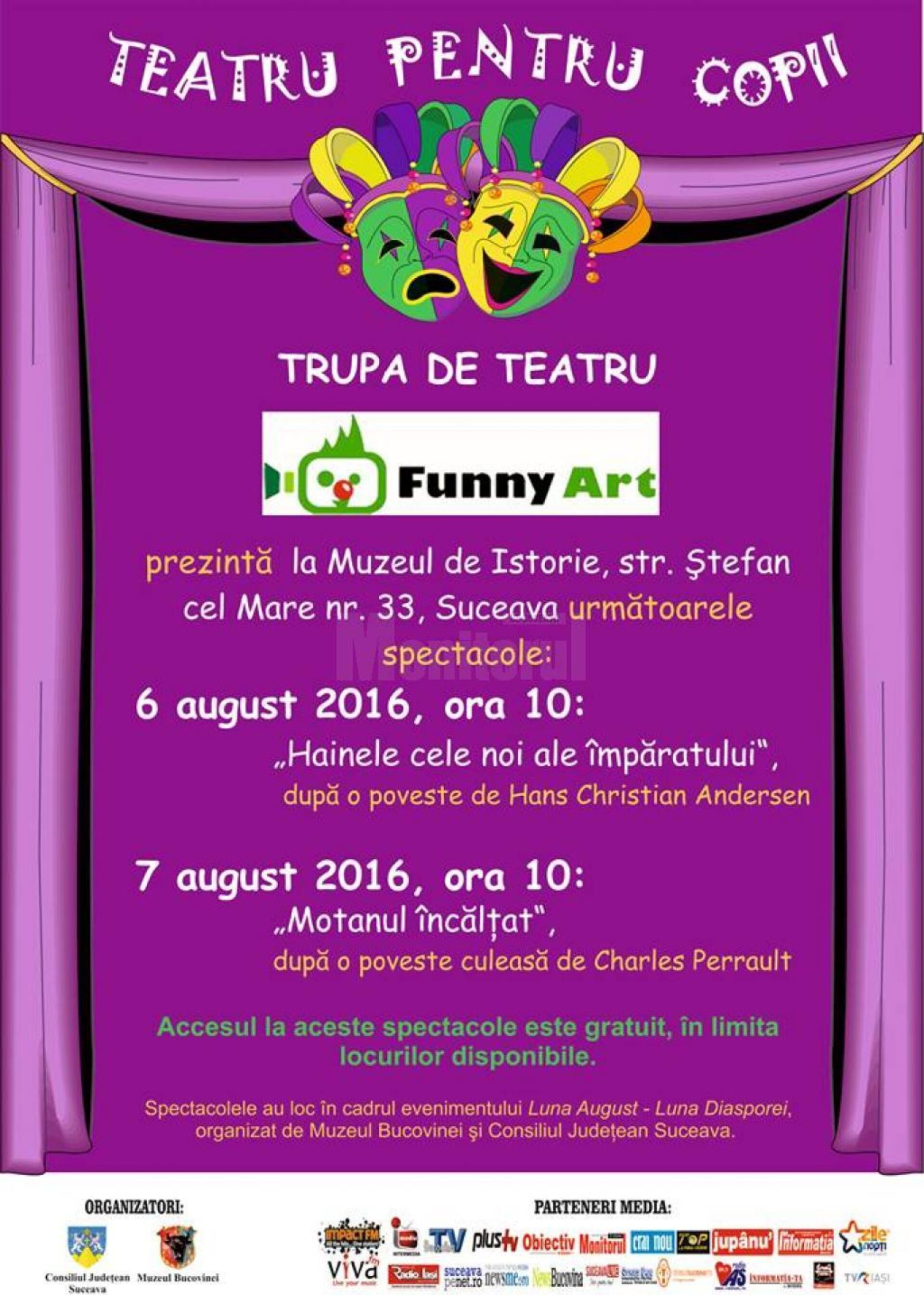 Trupa de treatru Funny Art prezintă la Muzeul de Istorie din municipiul Suceava spectacolele de teatru pentru copii „Hainele cele noi ale împăratului” – după o poveste de Hans Christian Andersen (sâmbătă, 6 august, ora 10.00) și „Motanul încălțat” – după o poveste culeasă de Charles Perrault (duminică, 7 august, ora 10.00). Spectacolele au loc în cadrul evenimentului „August – Luna Diasporei” organizat de Consiliul Județean Suceava. Accesul la spectacole este gratuit în limita locurilor diponibile.
