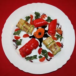 Tăiați dovleceii în fâșii subțiri, stropiți-le cu ulei și prăjiți-le pe plită. Lăsați-le să se marineze cel puțin 30 de minute într-un strat subțire de ulei cu un cățel de usturoi. Coaceți ardeii, curățați-i, tăiați-i fâșii, condimentați cu ulei și un cățel de usturoi, apoi lăsați să se marineze încă 30 de minute. Amestecați brânza cu iaurt și cu gălbenușurile și condimentați pasta cu puțin busuioc, sare și piper. Umpleți dovleceii și ardeii cu pasta de brânză și completați cu verdețuri. Puneți-le apoi într-o tavă și coaceți-le la 180 grade Celsius timp de 20 de minute.