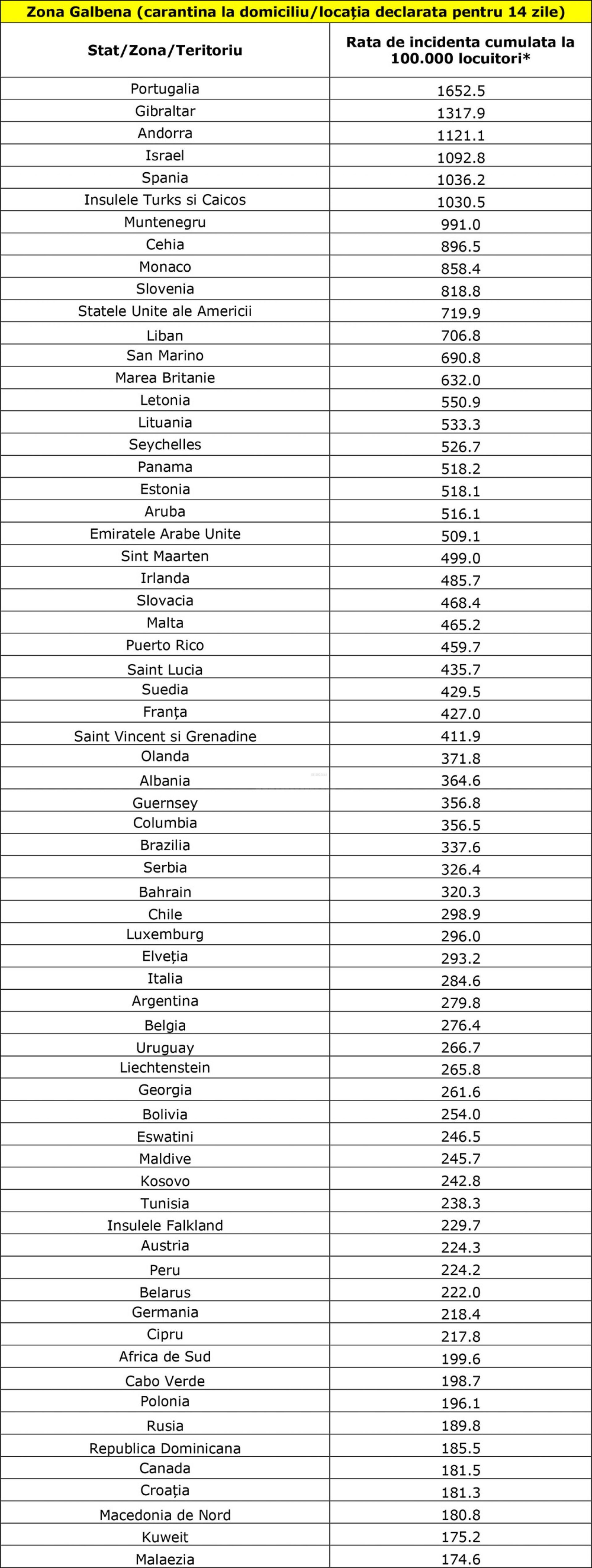 Comitetul Național pentru Situații de Urgență a decis, joi, că din data de 12 februarie a.c., toate persoanele care sosesc în România din țările și zonele din „Zona Galbenă” trebuie să prezinte obligatoriu certificatul unui test negativ RT-PCR pentru SARS-CoV-2, efectuat cu cel mult 72 de ore înainte de data intrării în țară. Pentru persoanele care vin din aceste țări și zone este obligatorie și carantina de 14 zile. Măsura se aplică inclusiv cetățenilor români. Pe lista actualizată a „Zonei Galbene” se află următoarele țări: Portugalia, Gibraltar, Andora, Israel, Spania, Insulele Turks și Caicos, Muntenegru, Cehia, Monaco, Slovenia, SUA, Liban, San Marino, Marea Britanie, Letonia, Lituania, Seychelles, Panama, Estonia, Aruba, Emiratele Arabe Unite, Sint Maarten, Irlanda, Slovacia, Malta, Puerto Rico, Saint Lucia, Suedia, Franța, Saint Vincent si Grenadine, Olanda, Albania, Guernsey, Columbia, Brazilia, Serbia, Bahrain, Chile, Luxemburg, Elveția, Italia, Argentina, Belgia, Uruguay, Liechtenstein, Georgia, Bolivia, Eswatini, Maldive, Kosovo, Tunisia, Insulele Falkland, Austria, Peru, Belarus, Germania, Cipru, Africa de Sud, Cabo Verde, Polonia, Rusia, Republica Dominicană, Canada, Croația, Macedonia de Nord, Kuweit și Malaezia.