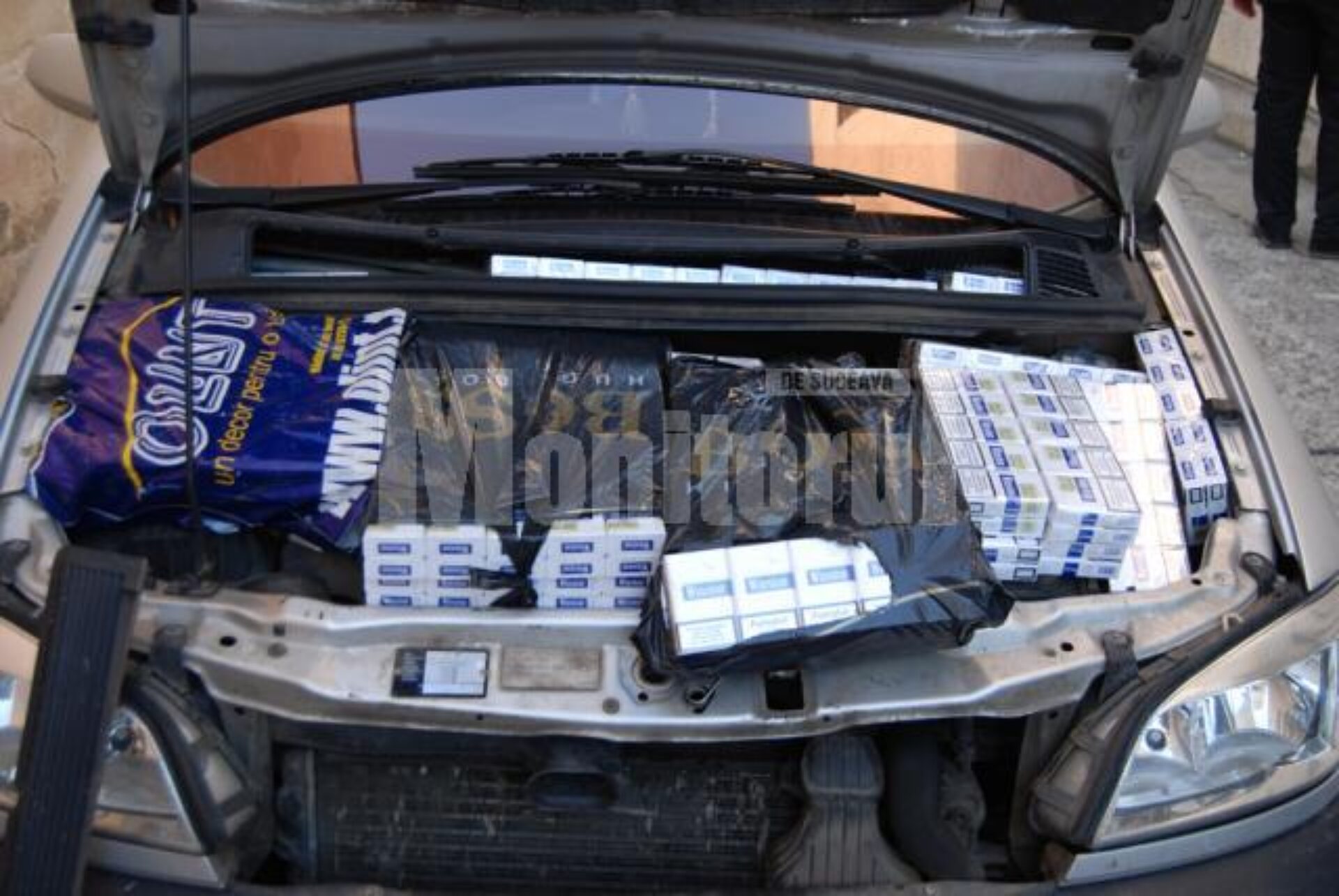 Polițiștii din orașul Siret au depistat, în urmă cu două zile, un autoturism „blindat” cu țigări cu timbru fiscal al Republicii Moldova, marfa de contrabandă fiind ascunsă sub capota motorului, în locul special destinat roții de rezervă, precum și în locurile destinate trusei de prim ajutor și triunghiului reflectorizant.
