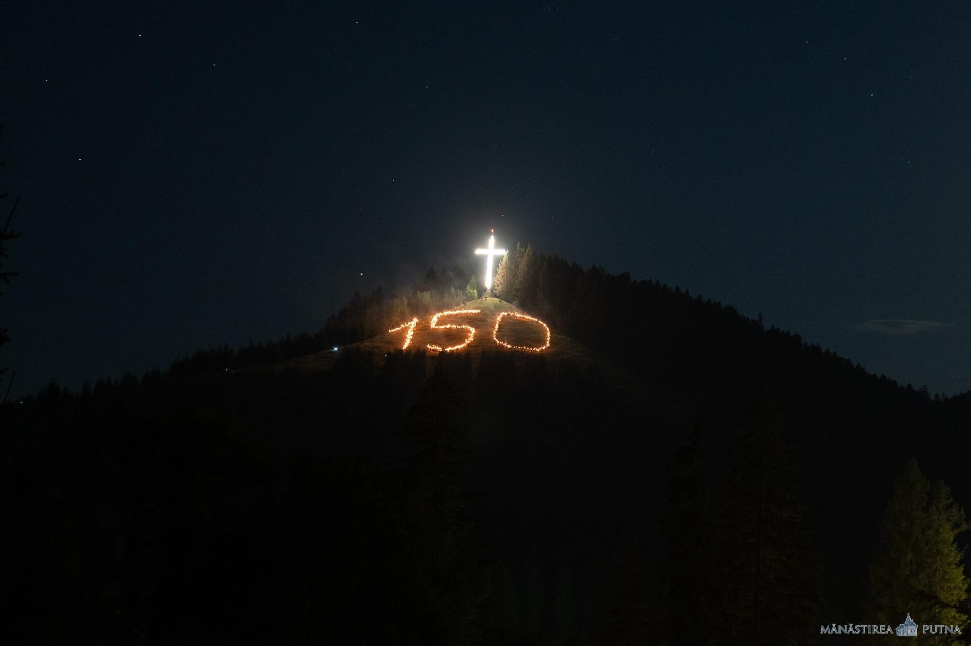 După ce au scris cu torțe „150”, tinerii au coborât dealul cântând, iar apoi au intrat în curtea mănăstirii cu torțele aprinse în mâini, înconjurând biserica. Aici au fost întâmpinați de Preasfințitul Părinte Ignatie al Hușilor, Preasfințitul Părinte Damaschin Dorneanul și de starețul mănăstirii, părintele Arhimandrit Melchisedec Velnic.