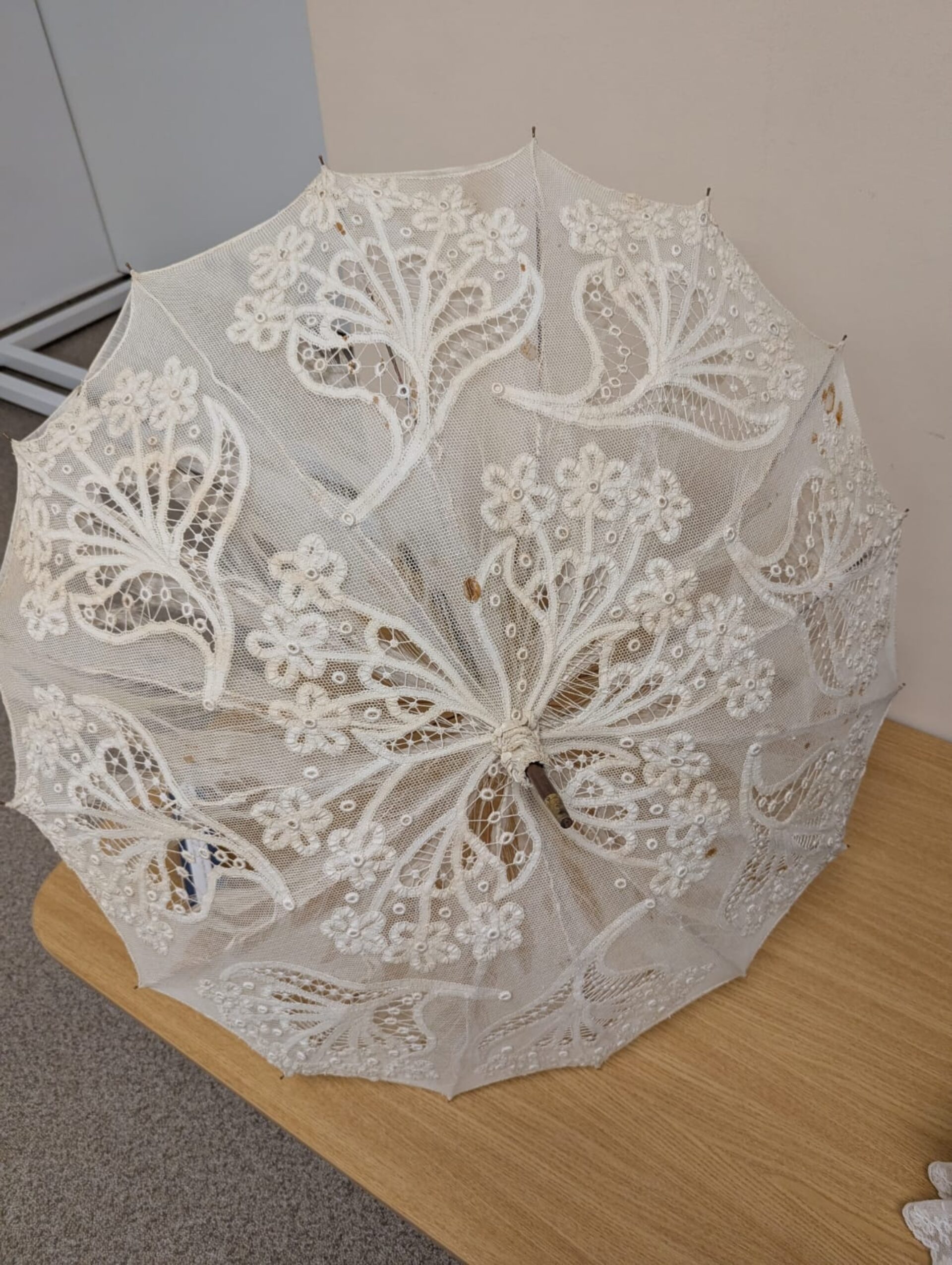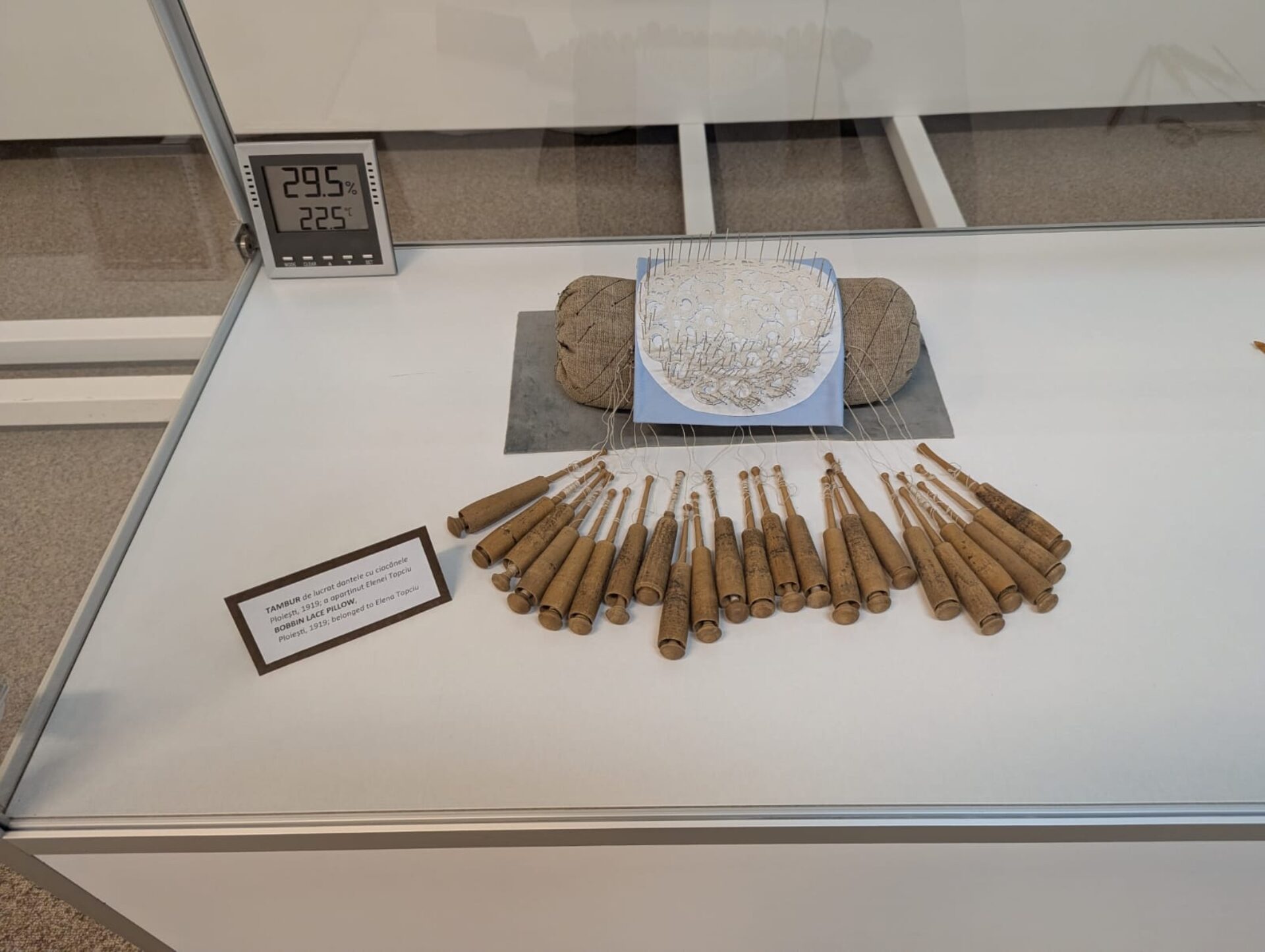 „Deși cunoaștem puține date sigure referitoare la originile acestei țesături delicate, principalele tehnici tradiționale – cu acul și cu ciocănelele – au progresat în tandem, de la dantele relativ simple, o bandă îngustă, geometrică de la începutul secolului al XVI-lea, la dantela tridimensională clasică, barocă din a doua jumătate a secolului al XVII-lea și până la plasa decorată de la sfârșitul secolului al XVIII-lea. Tranziția către o industrie în mare măsură mecanizată a determinat treptat declinul ireversibil al dantelei lucrate manual. Introducerea mașinii cu plasă bobinată <bobbin net> de către John Heathcoat a fost urmată rapid de inventarea mașinii de dantelă Leavers de către John Levers în 1813, care a fost adaptată pentru a utiliza tehnologia Jacquard în 1834. Astfel, apare o dantelă mecanică în sine (material textil ajurat cu model), datorită sistemului de programare a desenelor prin carton perforat, pe un război de țesut tul”, a explicat curatorul expoziției, muzeograful Ioana Constantin.