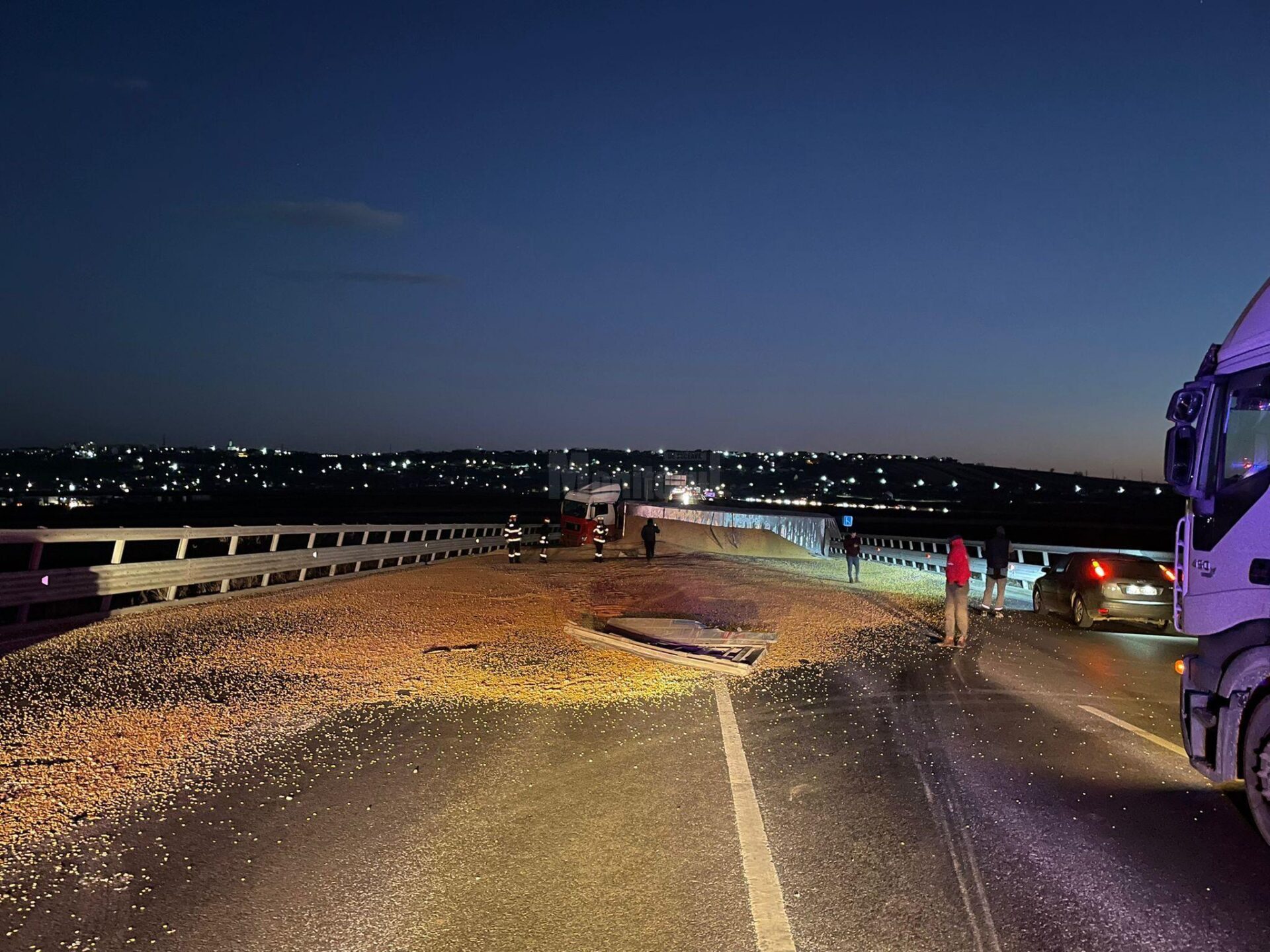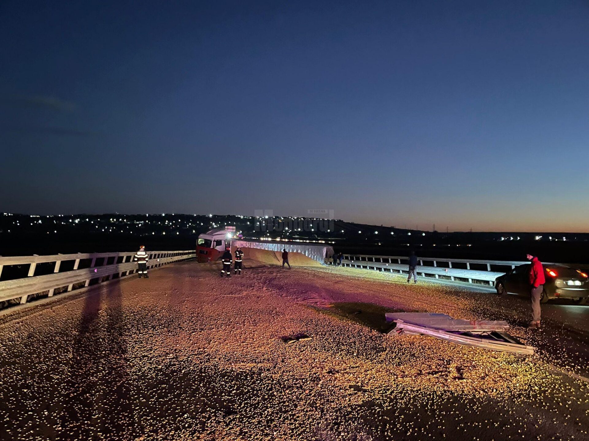 Un autotren încărcat cu cereale s-a răsturnat vineri seară pe șoseaua de centură a Sucevei, zona pasarelei de peste amenajarea rutieră de la Zidul Morții.
