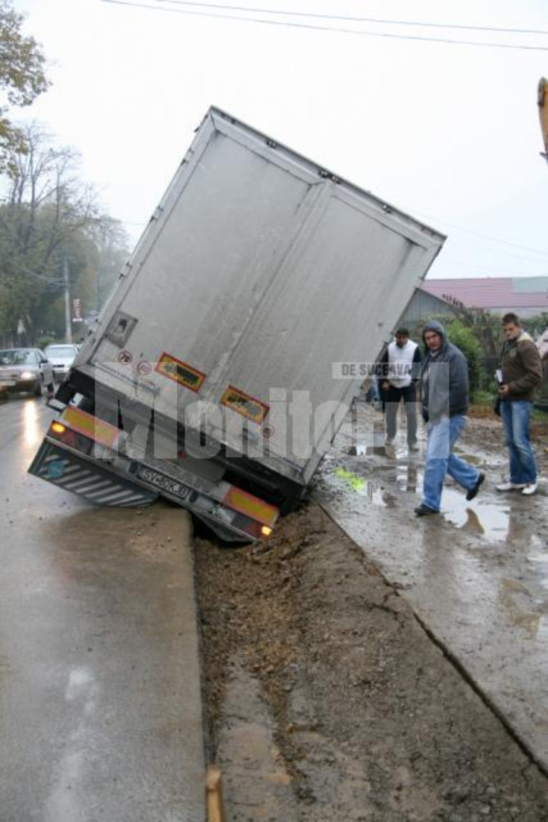 S-a întâmplat dimineață, în jurul orei 7.00, în dreptul casei 102 A, la câteva sute de metri de blocurile ANL din cartierul Burdujeni. Radu Ailenei, șoferul unui tir aparținând firmei Marinalex SRL Văratec, transporta peste 20 de tone de fier armat, venind din Grecia. Deoarece o mașină venea de pe sensul opus, acesta a tras puțin spre dreapta, fără a părăsi, însă, carosabilul. Șanțul săpat la marginea șoselei, unde au fost înlocuite conductele de canalizare, era acoperit cu pământ, aproximativ la nivelul șoselei, astfel că șoferul nu și-a dat seama de pericol, mai ales că nu exista nici urmă de indicator care să avertizeze că suprafața acoperită nu prezintă siguranță. Partea din spate a tirului încărcat cu fier s-a afundat brusc în pământ, nelipsind mult ca acesta să se și răstoarne.