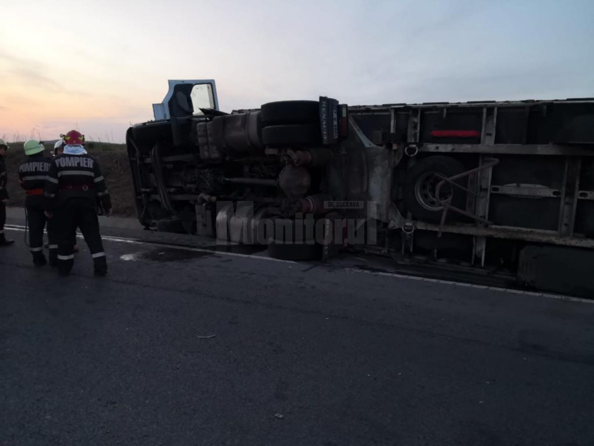 Un tir condus de un cetățean turc a fost implicat într-un accident rutier, miercuri seară, pe șoseaua de centură a Sucevei, în breteaua de ieșire spre Pătrăuți. Accidentul s-a înregistrat în jurul orei 20.30 iar șoferul de origine turcă a rămas încarcerat. Pompierii militari au intervenit cu două autospeciale de descarcerare, o mașină cu apă și spumă, ajutați de un echipaj al Serviciului Județean de Ambulanță Suceava. Bărbatul a fost găsit între cabină și remorcă, fiind extras conștient. Cetățeanul turc a fost transportat cu ambulanța SAJ la Spitalul Județean Suceava. La o primă evaluare, acesta nu avea leziuni foarte grave. Accidentul s-a produs în zona de curbă strânsă, cel mai probabil din cauza neadaptării vitezei și a intrării în tangaj. La fața locului au ajuns și polițiști rutieri, care au demarat cercetări pentru a stabili cum s-a produs accidentul.