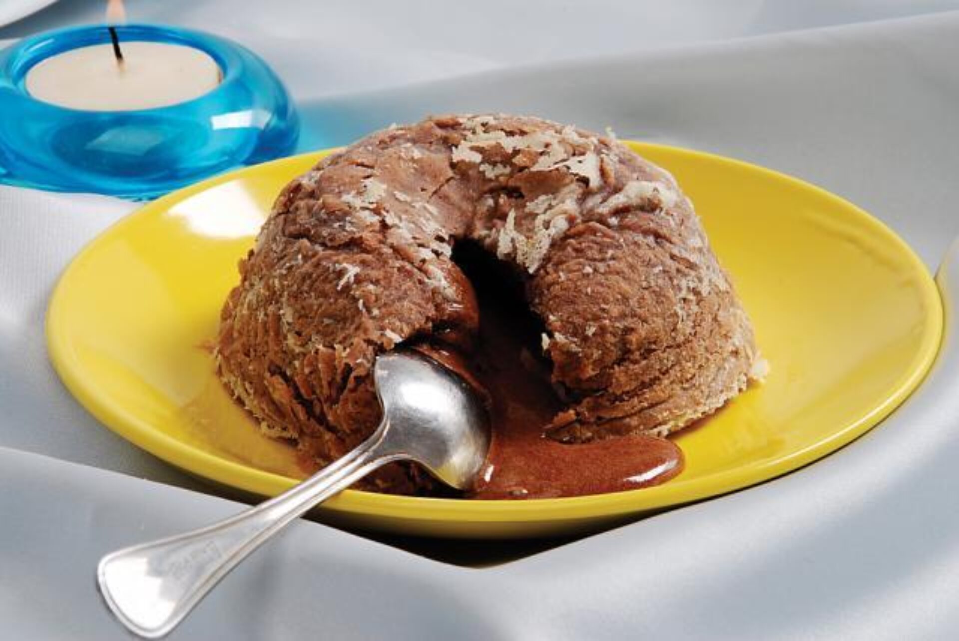 Topiți ciocolata și untul la foc mic. Bateți gălbenușurile cu zahărul, până când obțineți o compoziție cremoasă. Adăugați gălbenușurile bătute în compoziția cu ciocolată, după ce aceasta s-a răcit puțin. Bateți noua compoziție 5 minute pentru omogenizare. Bateți albușurile spumă. Când spuma se ține bine pe tel, adăugați treptat făina. Turnați compoziția cu ciocolată în cea de albușuri. Amestecați ușor prin răsturnare. Turnați compoziția în 6 forme mici termorezistente (eventual, folosiți forme de savarine), unse cu unt. Coaceți în cuptorul încălzit dinainte, la foc potrivit, 5-10 minute. Când s-a format o crustă tare deasupra, se pot scoate tăvițele din cuptor. Interiorul trebuie să rămână moale. Lăsați-le la răcit 5 minute și apoi scoateți-le cu o lingură mai mare. La servire se pot orna cu frișcă.
