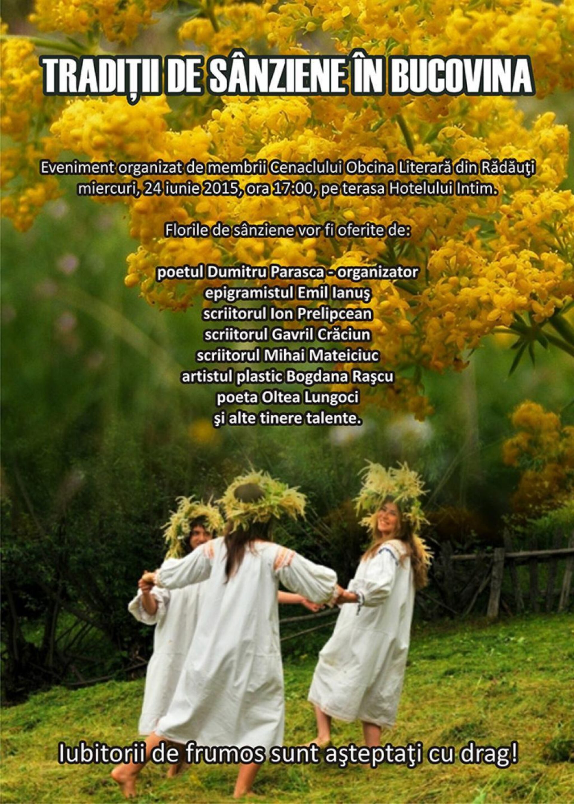 Membrii Cenaclului „Obcina literară” din Rădăuți organizează miercuri, 24 iunie, la ora 17.00, pe terasa Hotelului „Intim”, manifestarea cu genericul „Tradiții de Sânziene în Bucovina”.