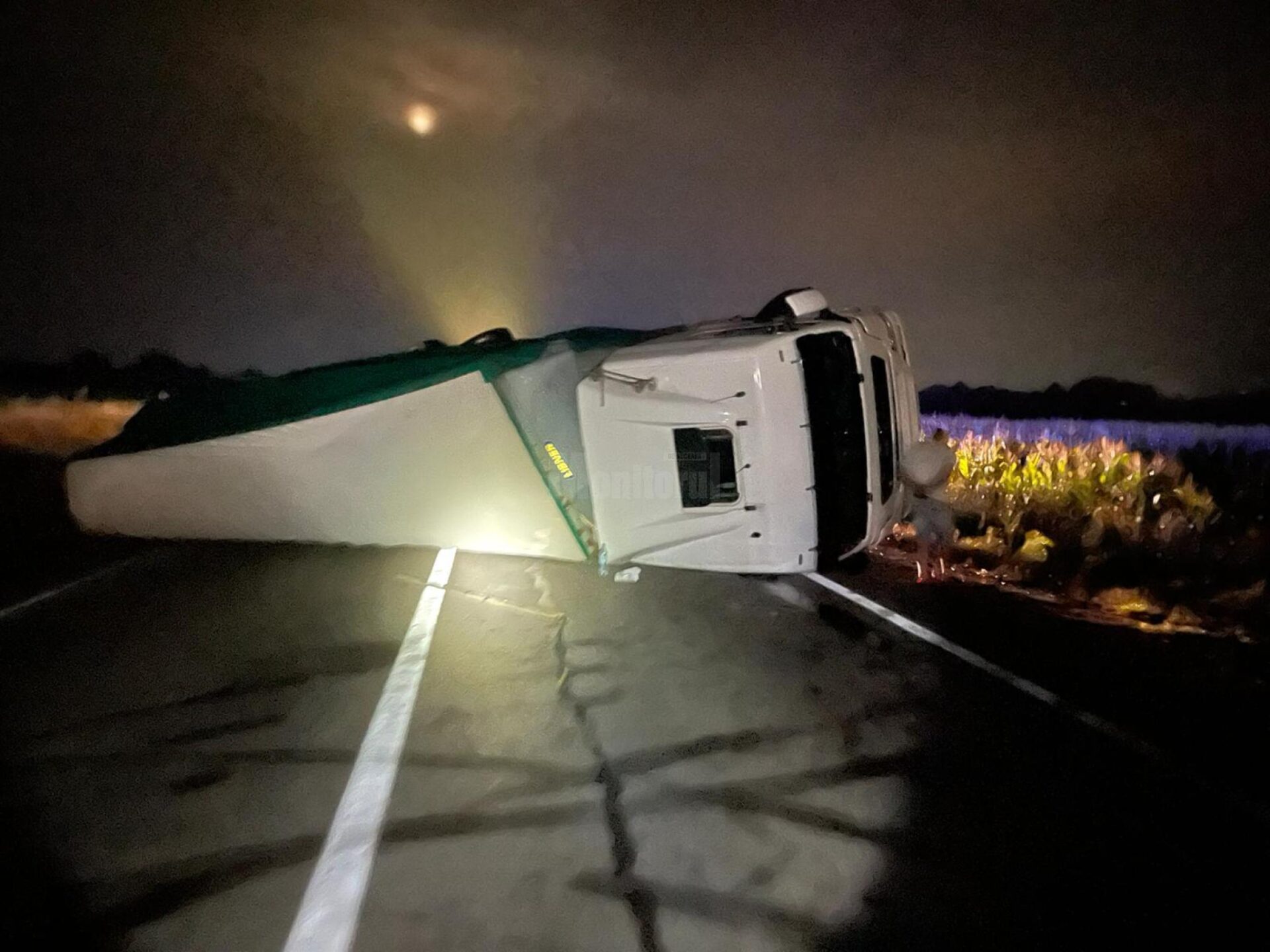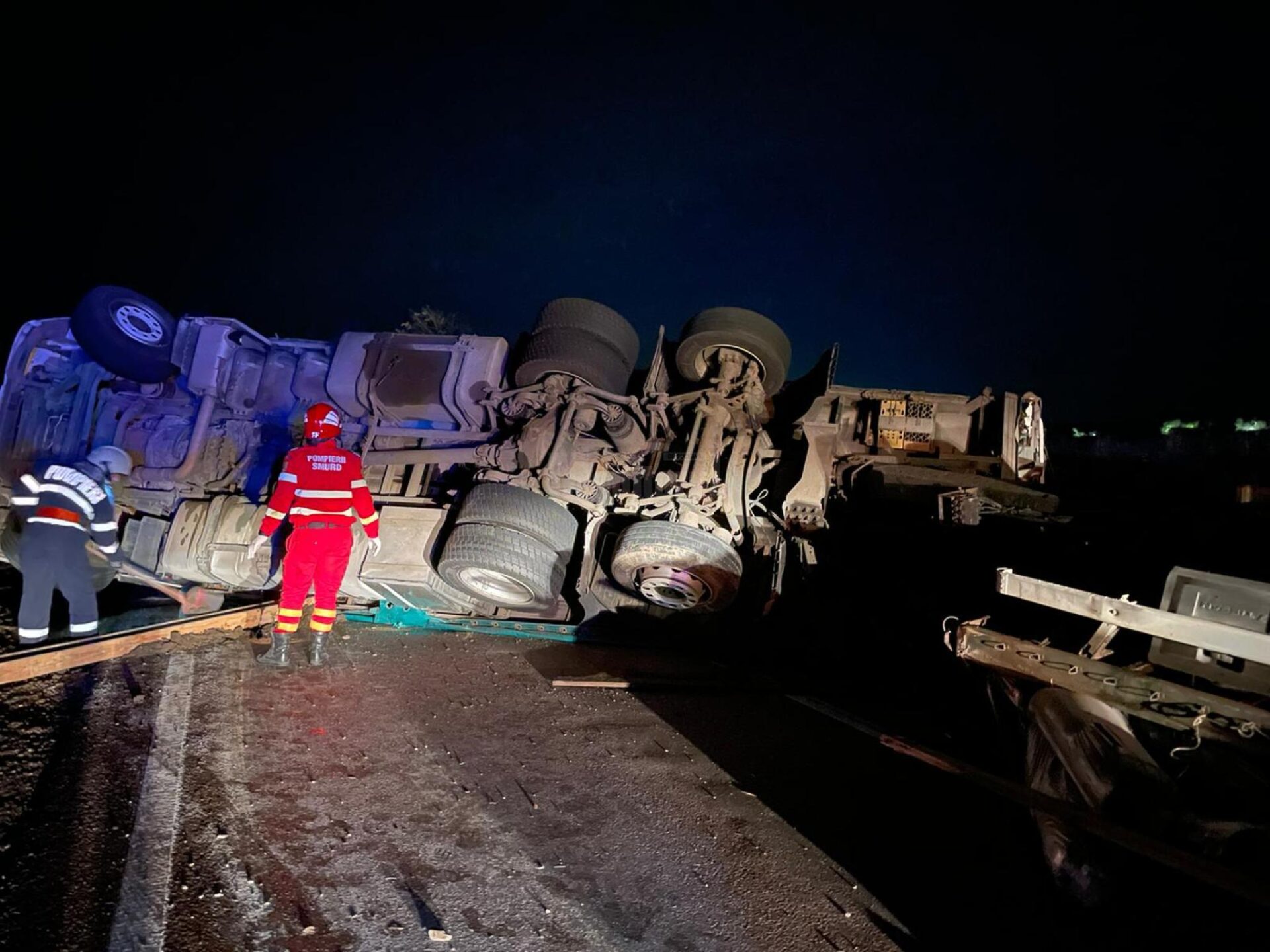 Trafic blocat la Dănila, azi noapte, după ce un tir s-a răsturnat pe partea carosabilă