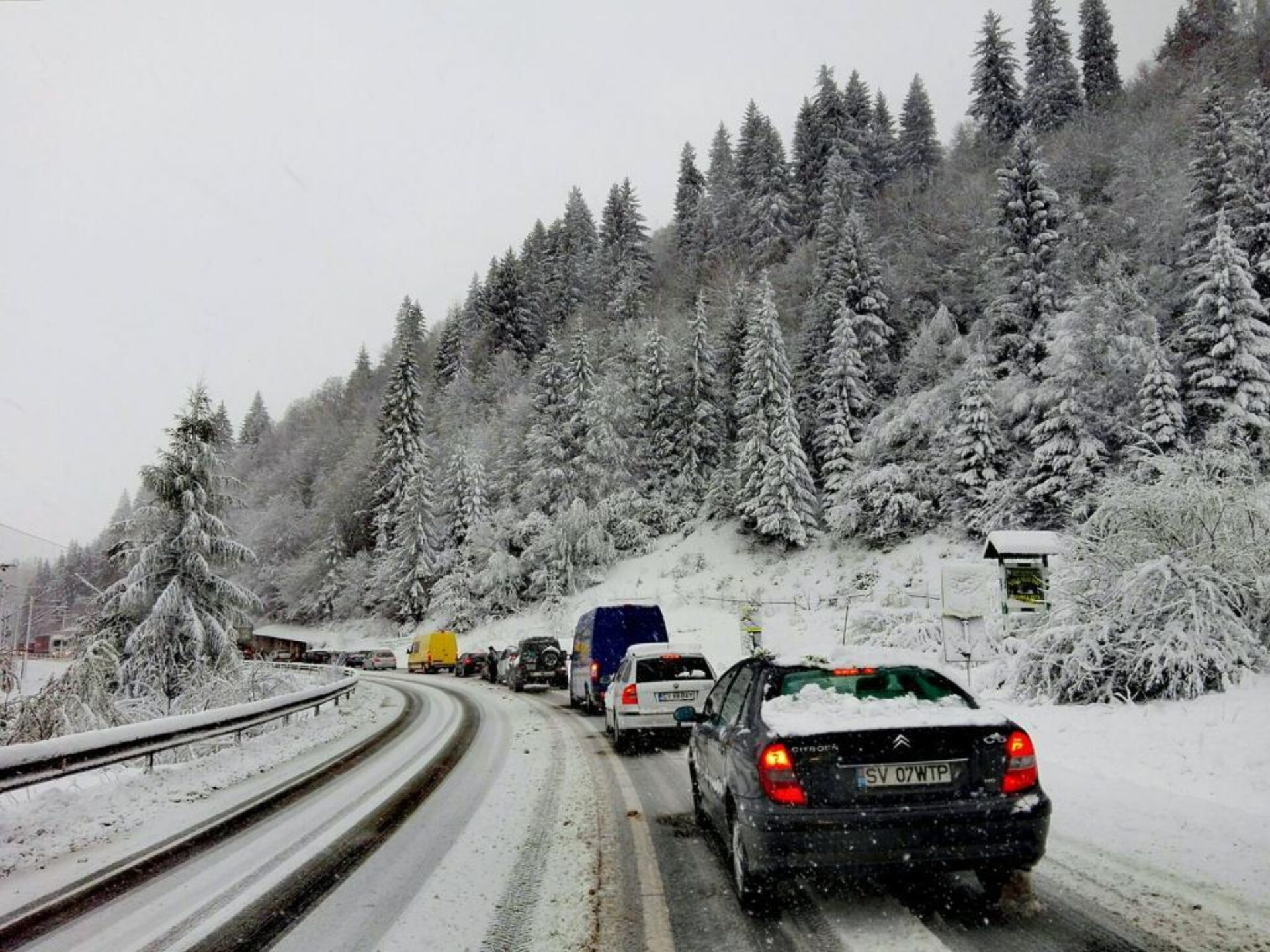 Trafic în condiții veritabile de iarnă, cu blocaje temporare de circulație, s-a înregistrat și la ieșirea din Vama spre Câmpulung Moldovenesc. Peisajul din trafic a fost la prima oră a dimineții unul realmente hibernal, după cum se vede și în fotografia surprinsă de un participant la trafic.