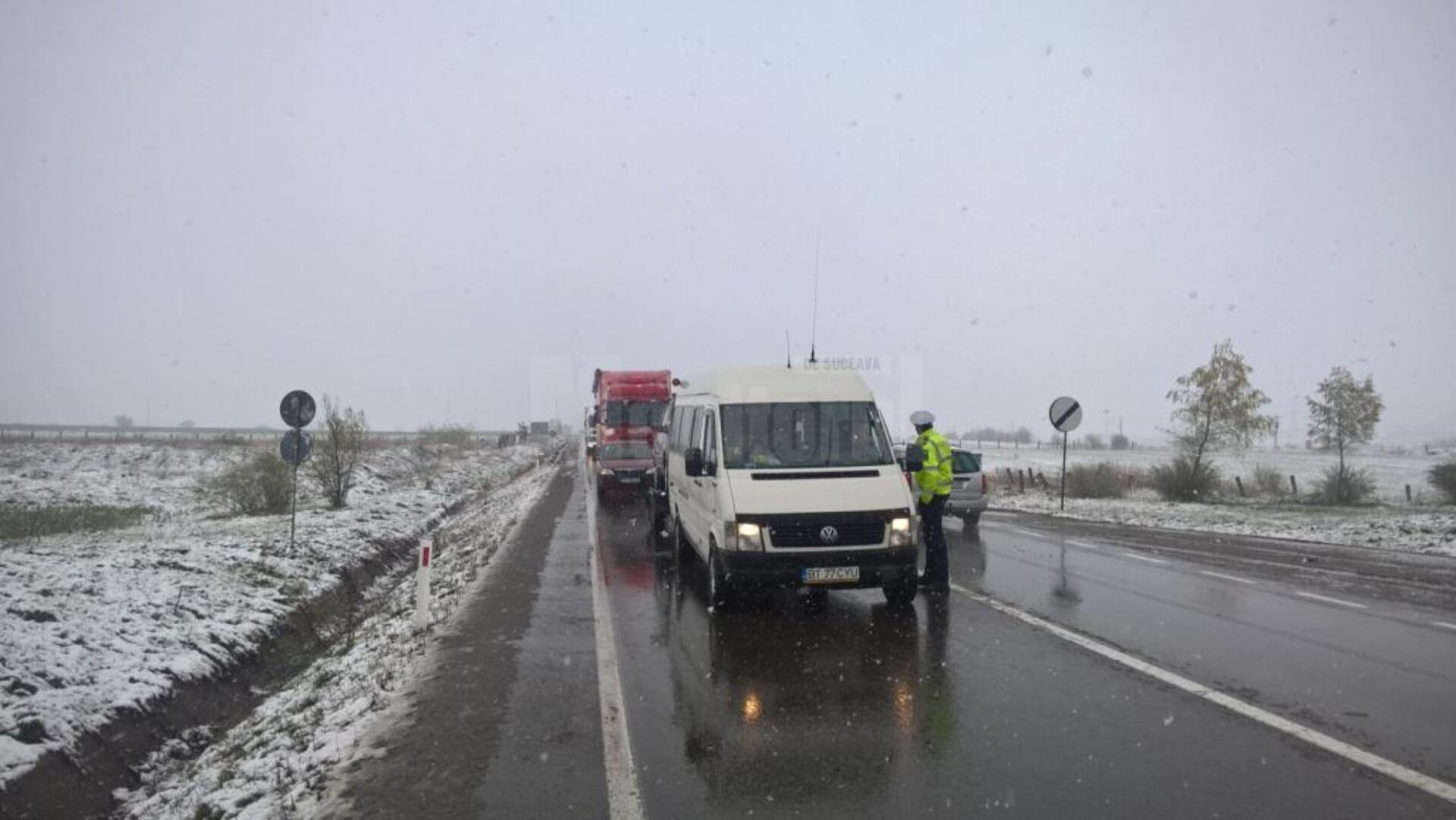 Poliția Rutieră a instalat un filtru la ieșirea de pe DN 17 la Trei Movile, unde echipajul rutier verifică dacă vehiculele sunt dotate cu cauciucuri de iarnă. Șoferii care au cauciucuri de vară la mașini sunt întorși din drum spre Suceava.