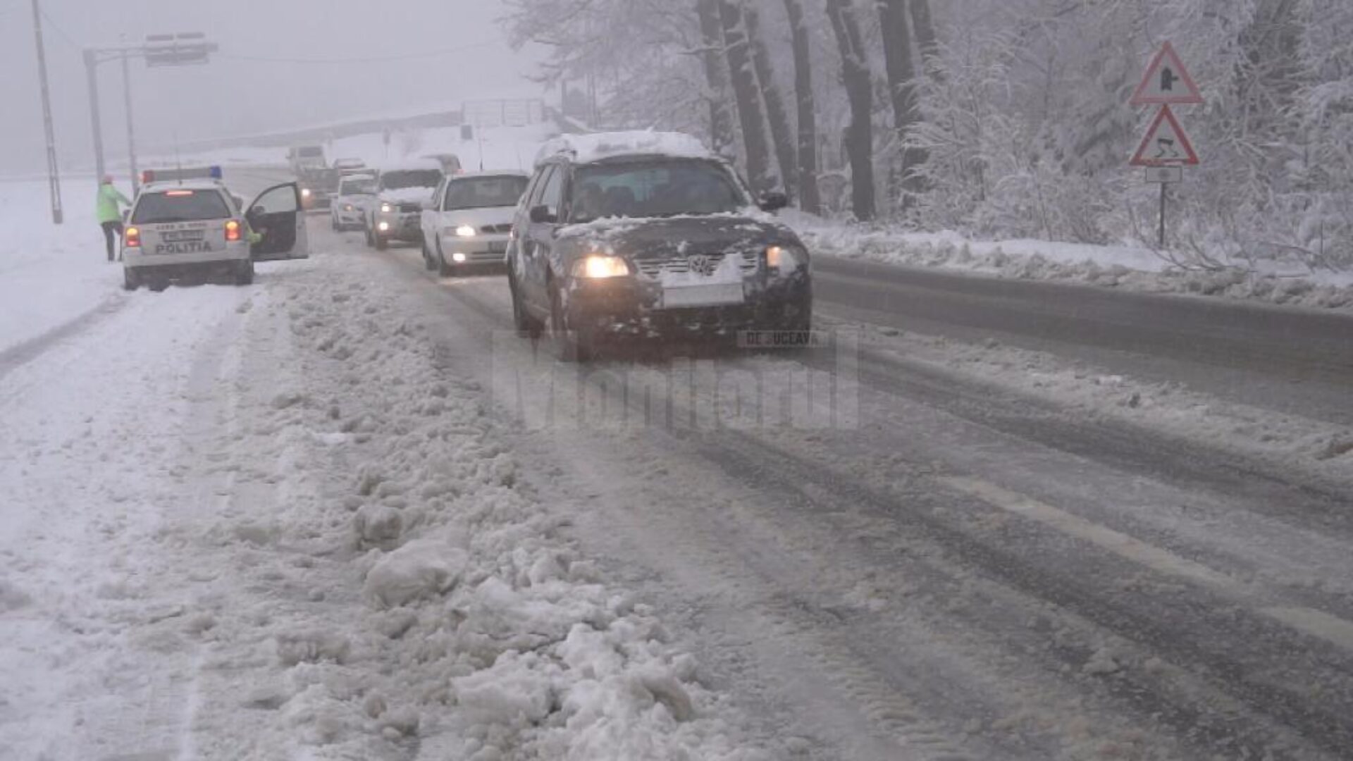 Intervenția lucrătorilor de la Secția de Drumuri Suceava nu a fost promptă de la prima oră a dimineții, astfel că multe vehicule grele nu au putut înainta, creându-se ambuteiaje.